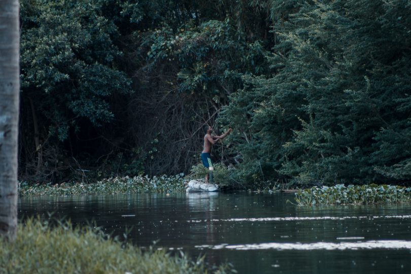 En la imagen, sobre una embarcación improvisada, un vecino de El Fanguito recolecta comida para sus animales.