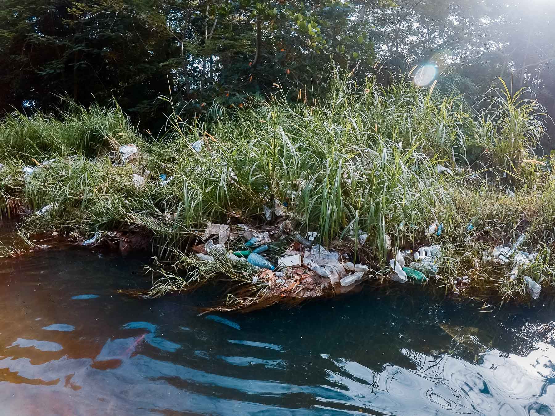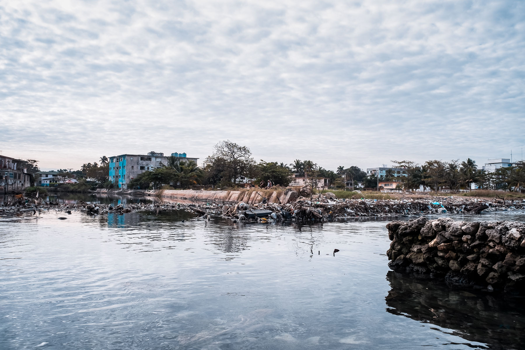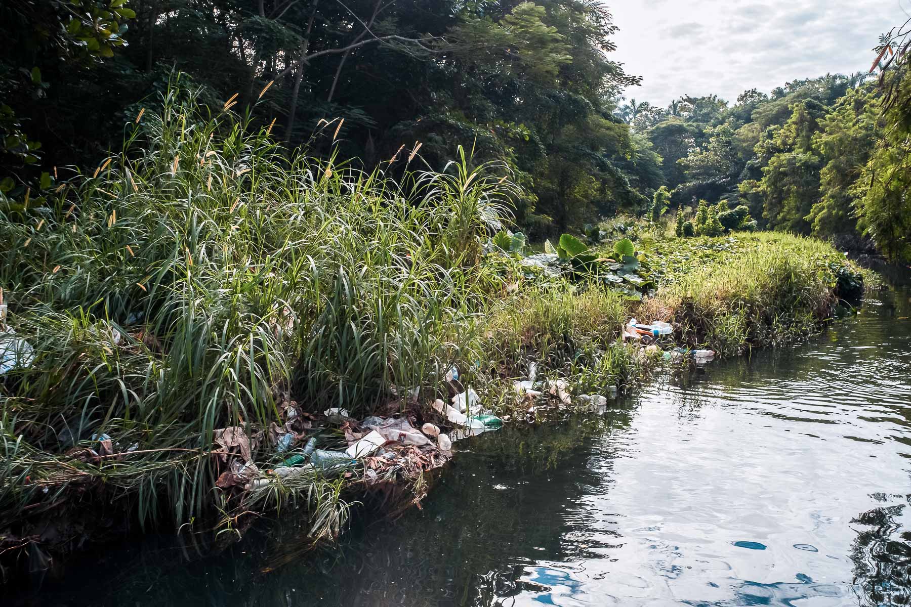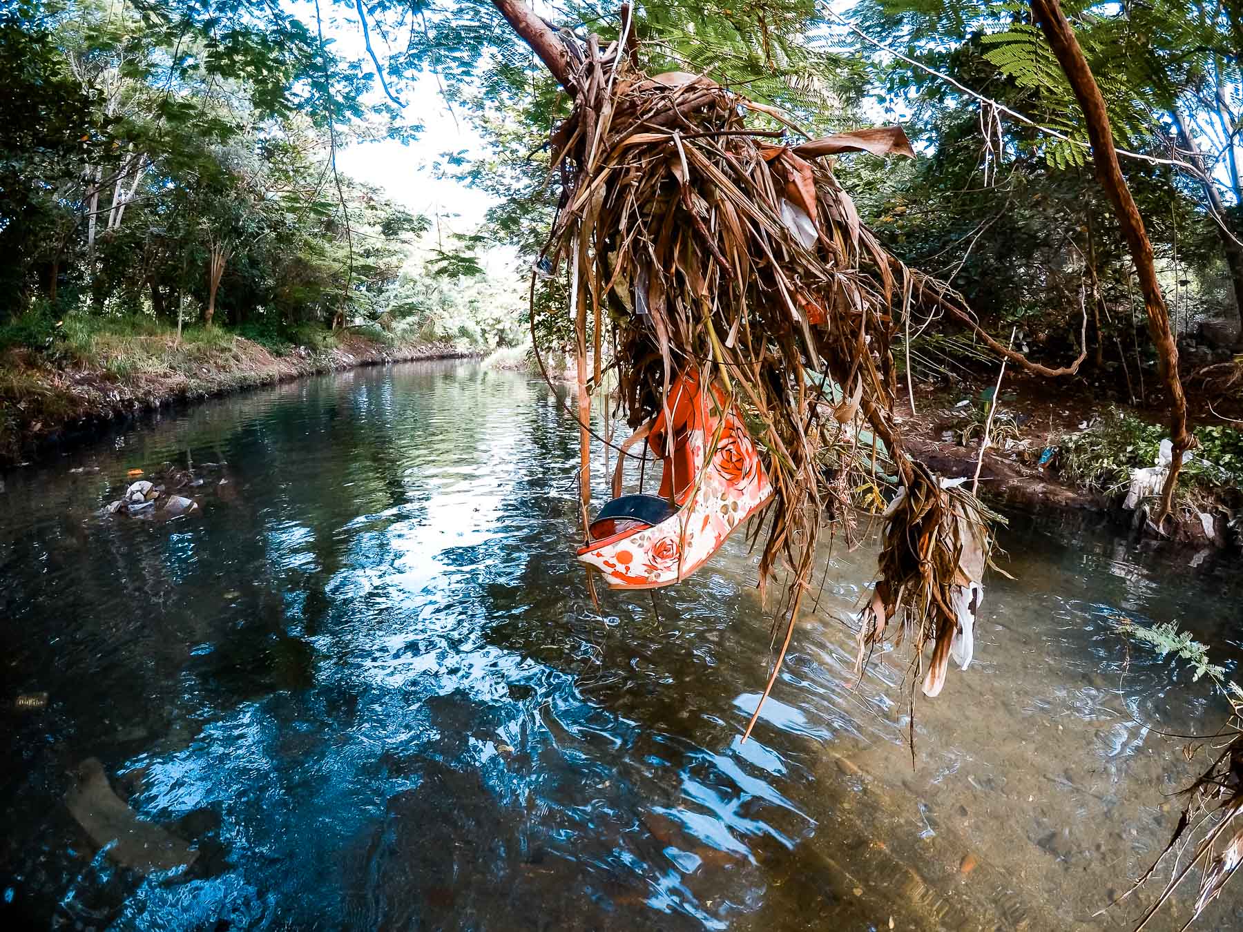 En su desembocadura, que divide Flores del reparto Náutico, el fondo es sintético. Kilogramos de basura cubren su lecho y sus orillas. Este litoral olvidado está a escasos metros de comunidades bastante habitadas. Un poco más adentro se empiezan a ver señales de vida, nenúfares y densa vegetación que se resisten a la basura, en esa batalla constante en que la naturaleza no se da por vencida y renueva, por tanto, la esperanza de que aún se puede salvar el río.