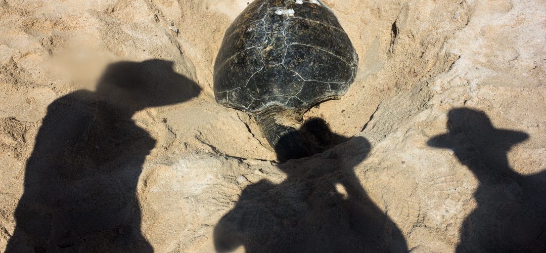Desenterrar los caparazones en Playa Cadenas nos tomó casi una hora. Sin palas ni utensilios tuvimos que retirar la arena con lo que encontramos: un pedazo de remo, un pedazo de tanque plástico, nuestras manos…