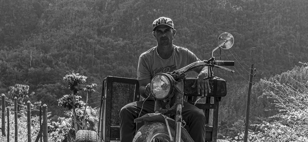 Al llegar a Caiguanabo, es el riquimbili, una adaptación de una moto Ural con un motor de regadío, el único transporte al que se puede recurrir para ir a Los Bermejales. Al fondo, la Sierra de la Güira (Foto: Lázaro Lemus).