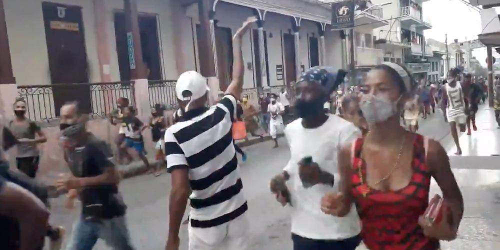 Media hora después, sobre las 4:30 se escuchó un rumor en la calle Aguilera, cuyo tráfico sube desde la zona de baja de bahía hasta uno de los extremos de la Plaza de Marte. Se trataba de miles de jóvenes que subían corriendo acaso buscando concentrarse frente al Partido Comunista. Coreaban “Díaz Canel, singao”, y “Patria y Vida”. El aspecto, la edad, género, origen social y grado de escolaridad de esta multitud era similar a la que ya estaba en la Plaza de Marte, varones jóvenes, de extracción popular y sin estudios universitarios. Aunque había pocas mujeres, estas a veces parecían lugartenientes que con voces finas y estridentes animaban a los jóvenes a no retirarse, a no huir, y avanzar hacia el Partido Comunista.
