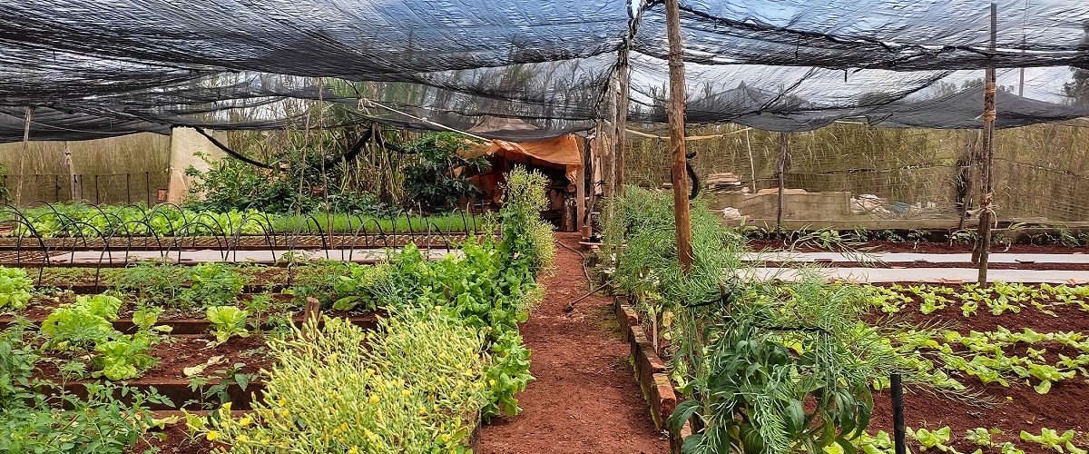 En los canteros hay lechuga, acelga, frutabomba, tomate. Están cuidadosamente ordenados en tres hileras.