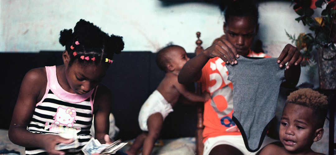 Betty cambia el culero a su hermano Liam; en primer plano el bebé Raymo, al fondo la pequeña Dayma (Foto: Lisandra Álvarez).