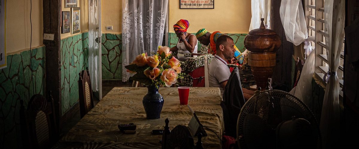 Son las seis de la tarde y el tambor a los muertos está a punto de acabarse. El Cabildo Fermina Gómez ati Eşu Dina es una feria llena de gente con prisa. Caminan de un lado a otro, hablan a la vez, llevan fuentes vacías a la cocina y transpiran en abundancia debajo de la ropa blanca. Una mujer amable nos ofrece asiento: “ya viene Dulce María”. La casa es grande, con ventanas y puertas que se abren y cierran sin cesar. Está cuidadosamente pintada y sobre las paredes se observan dibujos de signos religiosos y frases inspiradoras. El atardecer se fuga hacia un altar con fotos y vasos de agua. Sobre el borde de la copa principal la descomposición de la luz despliega un diminuto arcoíris. Se extingue al instante en que mis ojos se mueven a otro ángulo para estudiar la belleza de un Olokun frondoso, elegante.