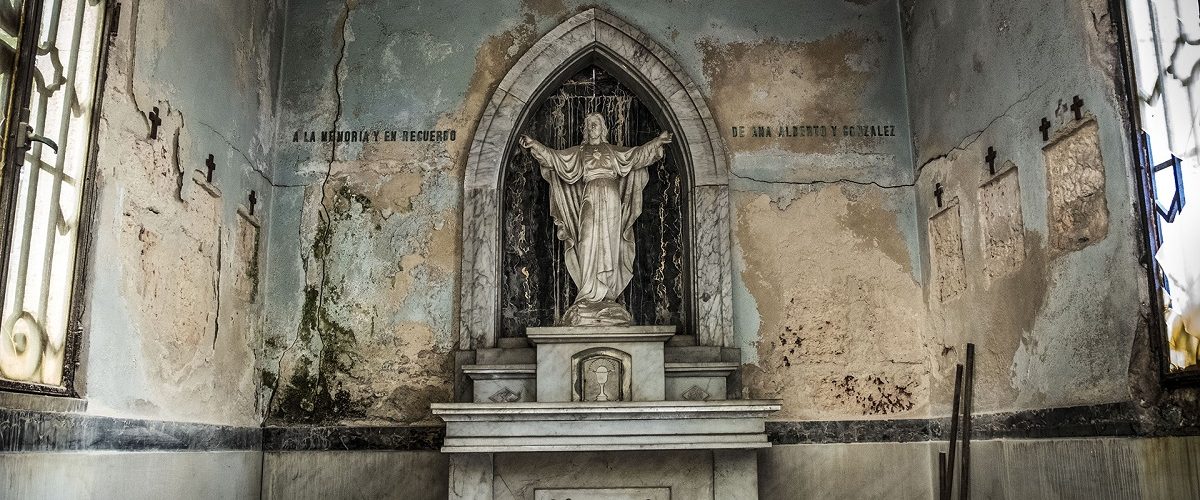 Escultura de Cristo da la bienvenida en bóveda derruida. Cementerio Colón, La Habana (Foto: Fabio Tomé Pestana).