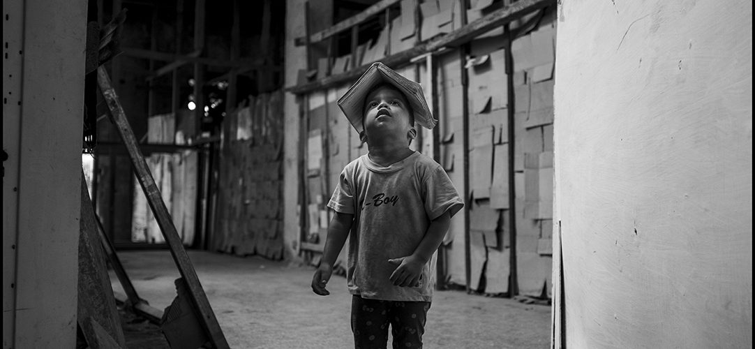 Retrato del pequeño William con un sillón viejo de su casa. En días de lluvia el niño juega por las instalaciones del albergue con su chubasquero (Foto: Manuel Almenares).
