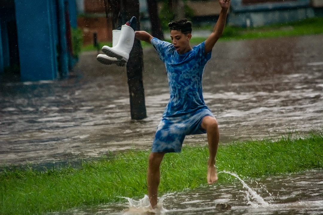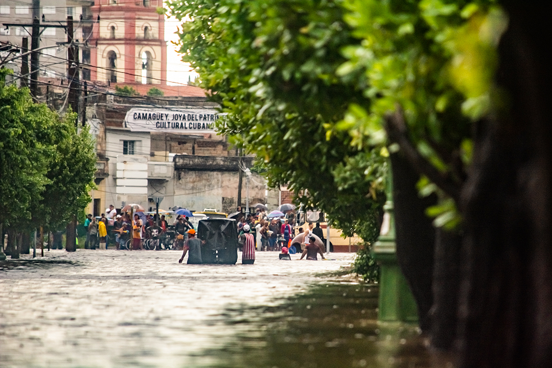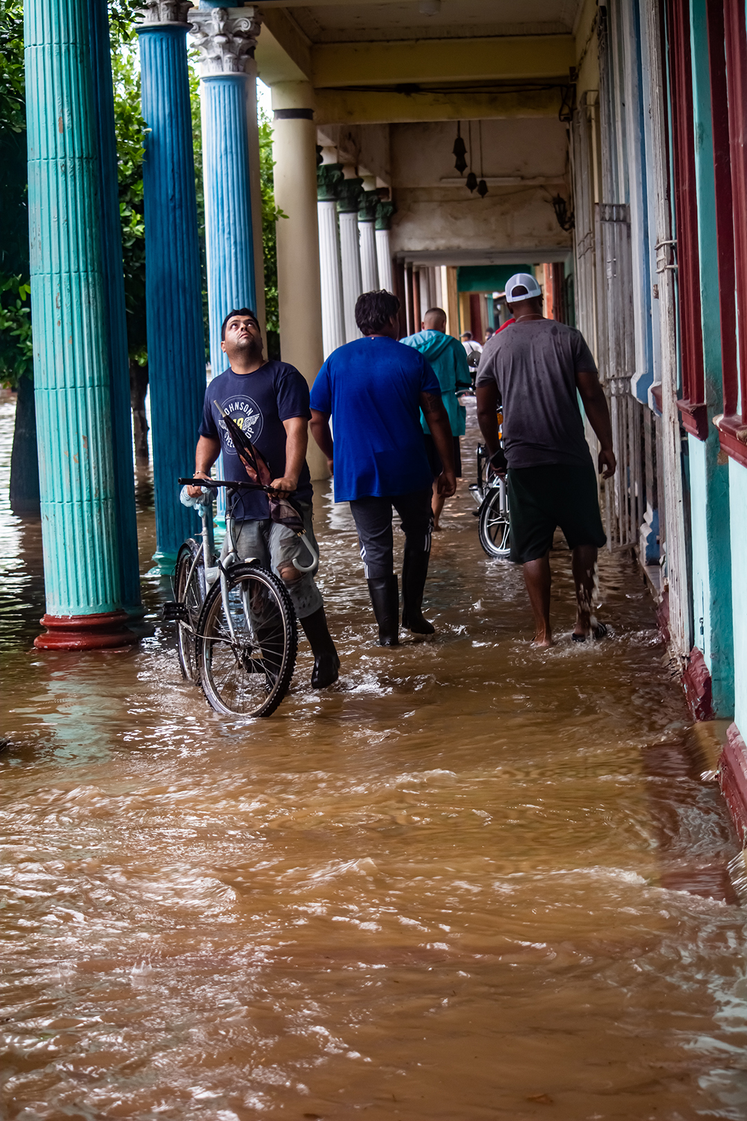 El 9 de junio salí a tomar fotos. El día avanzaba y varias personas comentaban sobre las inundaciones en los alrededores de los ríos Hatibonico y Juan del Toro. Caminé por la Avenida de la Caridad hasta encontrarme un río en vez de calle. Parecía una película. Casas escupiendo agua por la fachada; personas tratando de llegar de un lado a otro de la corriente; otros se sumergían en las aguas como si fuese un juego. A lo lejos, el cartel colocado hace poco para enaltecer la ciudad: “Camagüey, joya del patrimonio cultural cubano”.