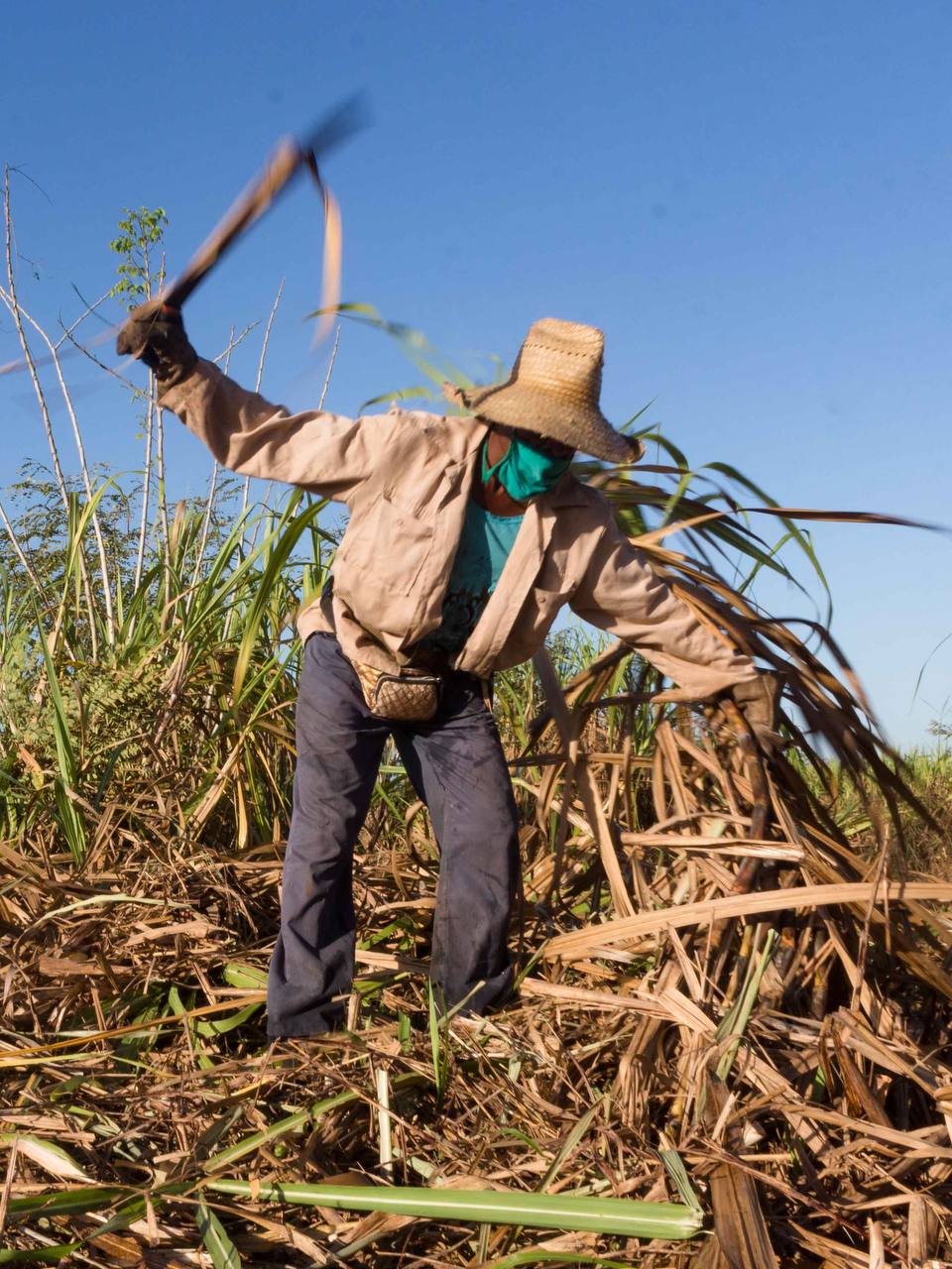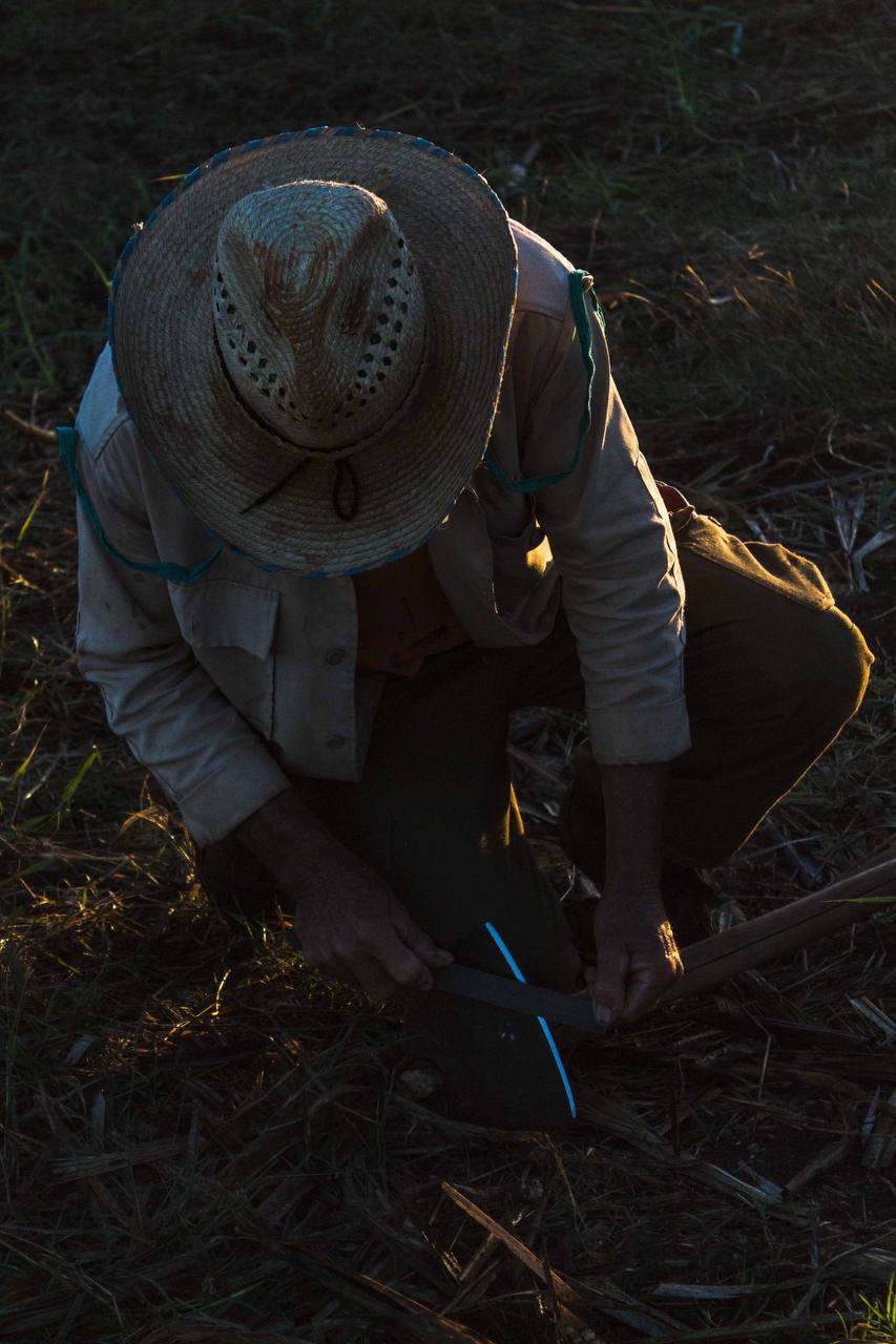 El trabajo es duro, pero las manos callosas están habituadas al machete y la guataca. Las ropas y sombreros no los protegen lo suficiente del sol y los insectos, pues la mayoría carecen de los medios de protección adecuados para estas labores. Es por ello que trabajan rápido, para culminar antes de que los alcance el irresistible sol del mediodía. En el descanso se afilan los precarios instrumentos, se toma agua y nos reímos de anécdotas graciosas, siempre hay una historia para contar.