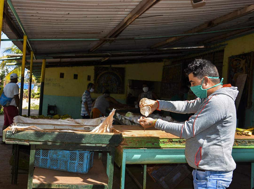 A un par de kilómetros de allí, en el barrio Cuabitas –actualmente con cuatro manzanas marcadas con cinta plástica amarilla y cerco de policías–, no todos los ventorrillos han permanecido cerrados en los últimos días, pero donde antes florecían a precios tensos el boniato, la col, el tomate, el plátano y la remolacha, ahora hay apenas anaqueles vacíos. Sobre el mostrador, en una esquina o una caja, venden los únicos productos en existencia: polvo de especias deshidratadas del tamaño de dosis personales, así como bolsitas y pomos plásticos de refrescos reenvasados con vinagres amarillentos y turbios.