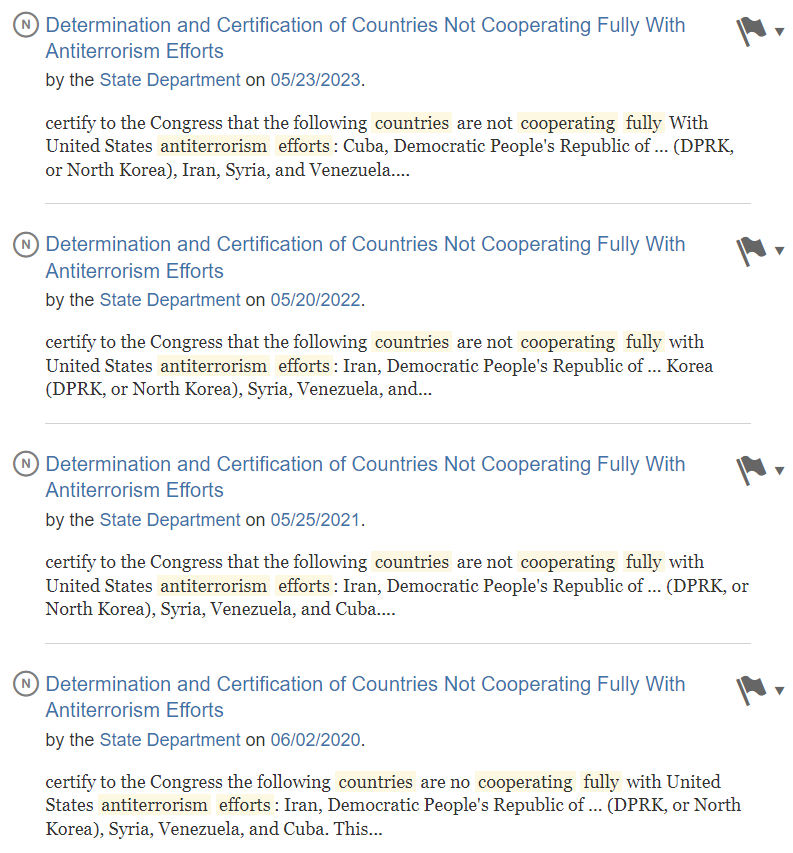 El argumento principal para que Cuba permanezca en ambas listas, como se ve, ya no existe. Pese a lo asegurado por Patel, sí parece haber una relación entre ambas, tomando en cuenta las fechas de los anuncios determinadas por el calendario. Si revisamos la página web del Federal Register, publicación oficial del gobierno federal de los Estados Unidos, vemos que una vez al año el Secretario de Estado debe informar al Congreso cuáles son los países que no cooperan con la lucha antiterrorista. Esto lo hace cumpliendo lo dictado por la sección 40A de la Ley de Control de Exportación de Armas (22 U.S.C. 2781). Si ponemos en el buscador: “Determination and Certification of Countries Not Cooperating Fully With Antiterrorism Efforts”, los resultados mostrarán que dicha determinación siempre ocurre en mayo, y se publica no más de una semana después en el Federal Register.
