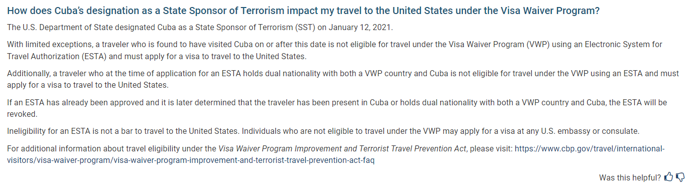 La inclusión de Cuba en la lista de países patrocinadores del terrorismo ha tenido, no obstante, un impacto imprevisto para un gran sector de la población: los ciudadanos cubanos con doble ciudadanía. Lo que comenzó como un rumor a finales de 2021 e inicios de 2022 se confirmó al acabar ese año: debido a la nueva inclusión de Cuba en la lista de países patrocinadores del terrorismo, aquellas personas que hayan viajado a la Isla a partir de enero de 2021, así como los ciudadanos con doble nacionalidad, una de ellas cubana, ya no son elegibles para obtener un permiso ESTA (Sistema Electrónico para la Autorización de Viaje) bajo el Programa de Exención de Visa, y están obligados a solicitar un visado en una embajada o consulado estadounidense.