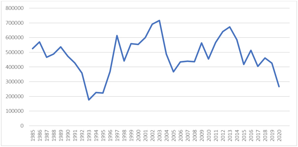 De enero a septiembre de 2021 se produjeron únicamente 138 400 toneladas, y para 2022 se proyecta un total de 180 000. Esta cifra representa solo 3236 toneladas más que las cosechadas en 1993, el punto más bajo de la producción nacional de 1985 a 2020.