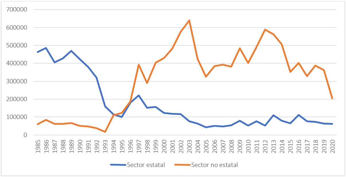 Con respecto a la producción nacional, las toneladas cosechadas por el sector no estatal superan a las del estatal desde 1997. De hecho, las del primero representaron el 64.7% del total de toneladas cosechadas de 1985 a 2020.