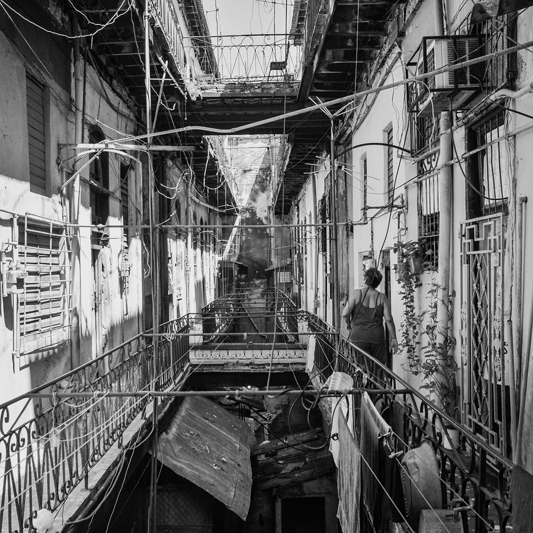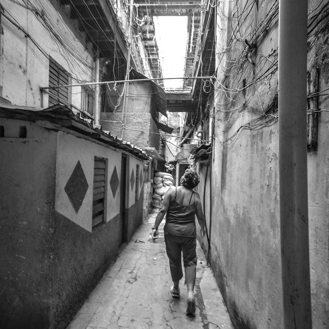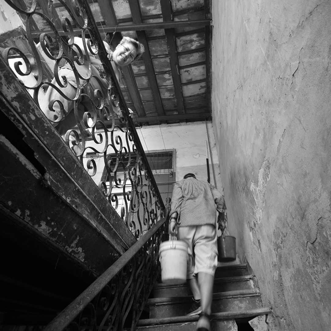 Una cara ajena es vista con sospecha y cierto repudio, por eso es necesario entrar con alguien del lugar. Ella me presenta como un fotógrafo extranjero que viene a interesarse por la situación de las viviendas. Algunos sonríen y me dan la bienvenida. Otros me ignoran silenciosamente. Hace un par de años, las viviendas del tercer y cuarto piso no tienen servicio de agua; hay grietas en las paredes y los pisos por donde entra la lluvia. Me piden que pise ligero, pues los pasillos exteriores están sostenidos por vigas de hierro desgastado. Tienen mucho miedo al desprendimiento.