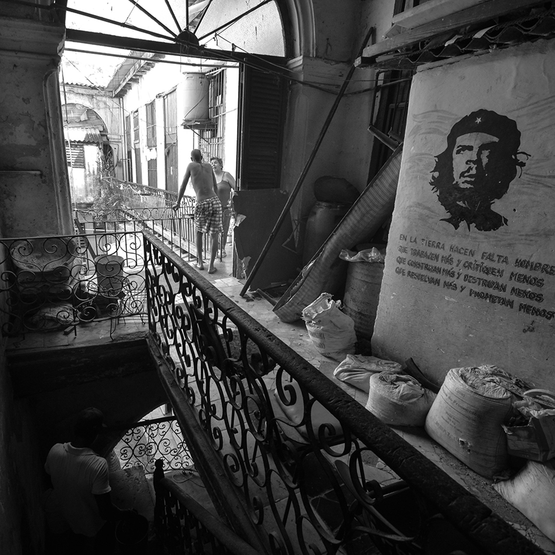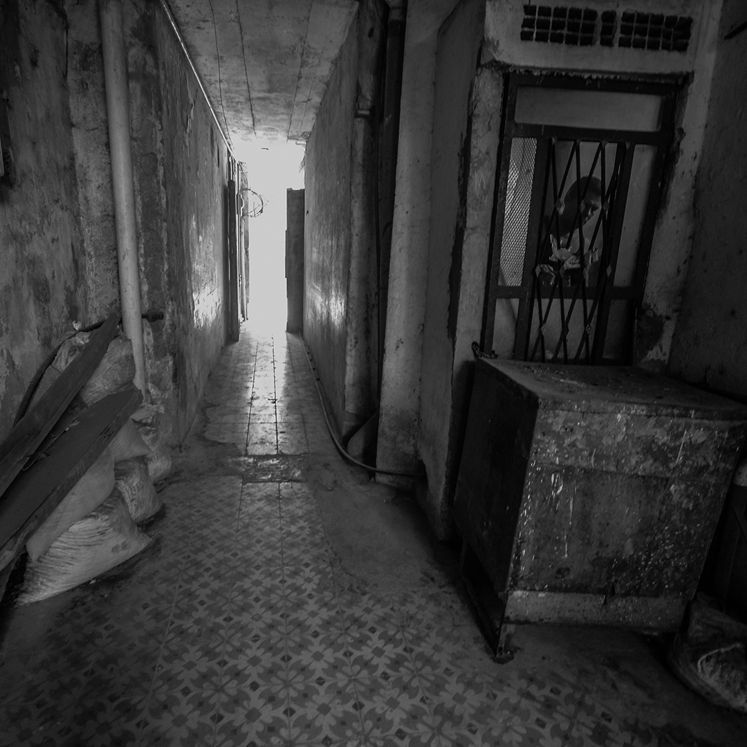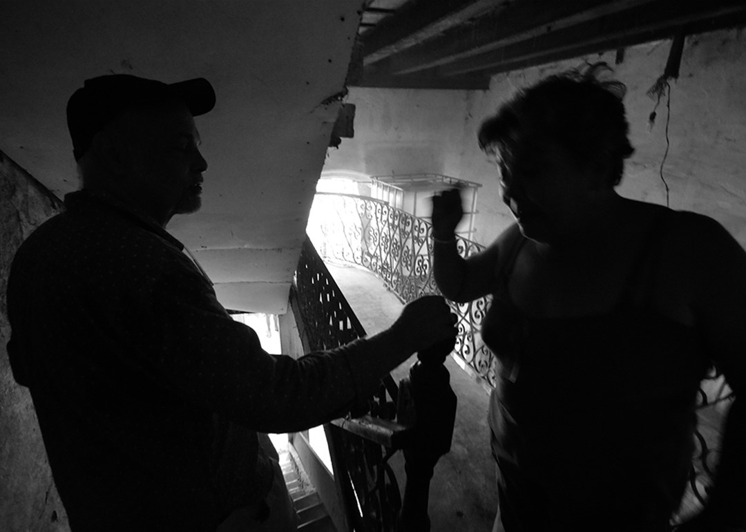 Una cara ajena es vista con sospecha y cierto repudio, por eso es necesario entrar con alguien del lugar. Ella me presenta como un fotógrafo extranjero que viene a interesarse por la situación de las viviendas. Algunos sonríen y me dan la bienvenida. Otros me ignoran silenciosamente. Hace un par de años, las viviendas del tercer y cuarto piso no tienen servicio de agua; hay grietas en las paredes y los pisos por donde entra la lluvia. Me piden que pise ligero, pues los pasillos exteriores están sostenidos por vigas de hierro desgastado. Tienen mucho miedo al desprendimiento.