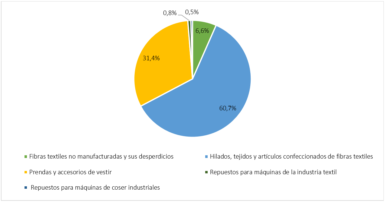 De acuerdo con la ONEI, el sector fabrica productos textiles y prendas de vestir. Dentro de los primeros se encuentran las hilazas y tejidos de algodón; tejidos de fibras sintéticas; sogas, cordeles e hilos de henequén; sacos de kenaf; colchones, colchonetas y sábanas; mientras que las segundas incluyen ropa interior y exterior, como camisas, pantalones, sayas y vestidos.