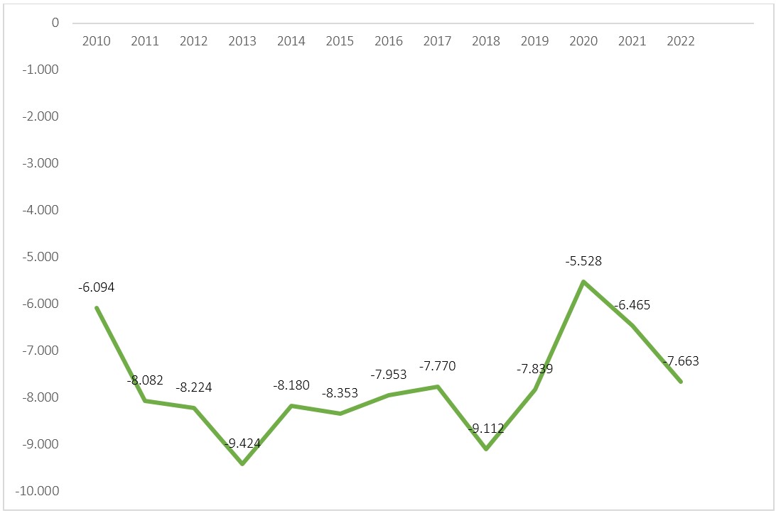 La Isla presenta un déficit en el saldo comercial de mercancías desde 2010. Ello implica que las importaciones de bienes del país han sido mayores que sus exportaciones durante más de una década.