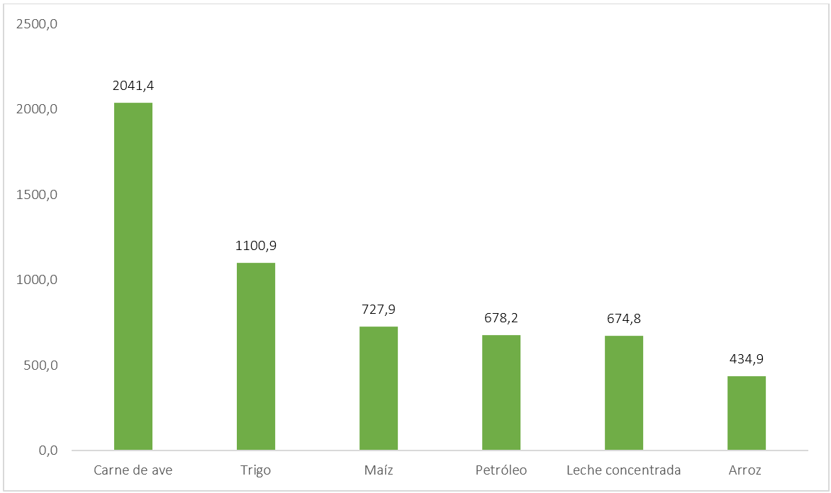 De 2016 a 2022 Cuba destinó 5.658 millones de dólares a la importación de alimentos y petróleo. Dentro de los primeros, la mayor cantidad de fondos se destinó a la carne de ave, seguida por trigo, maíz, leche concentrada y arroz.