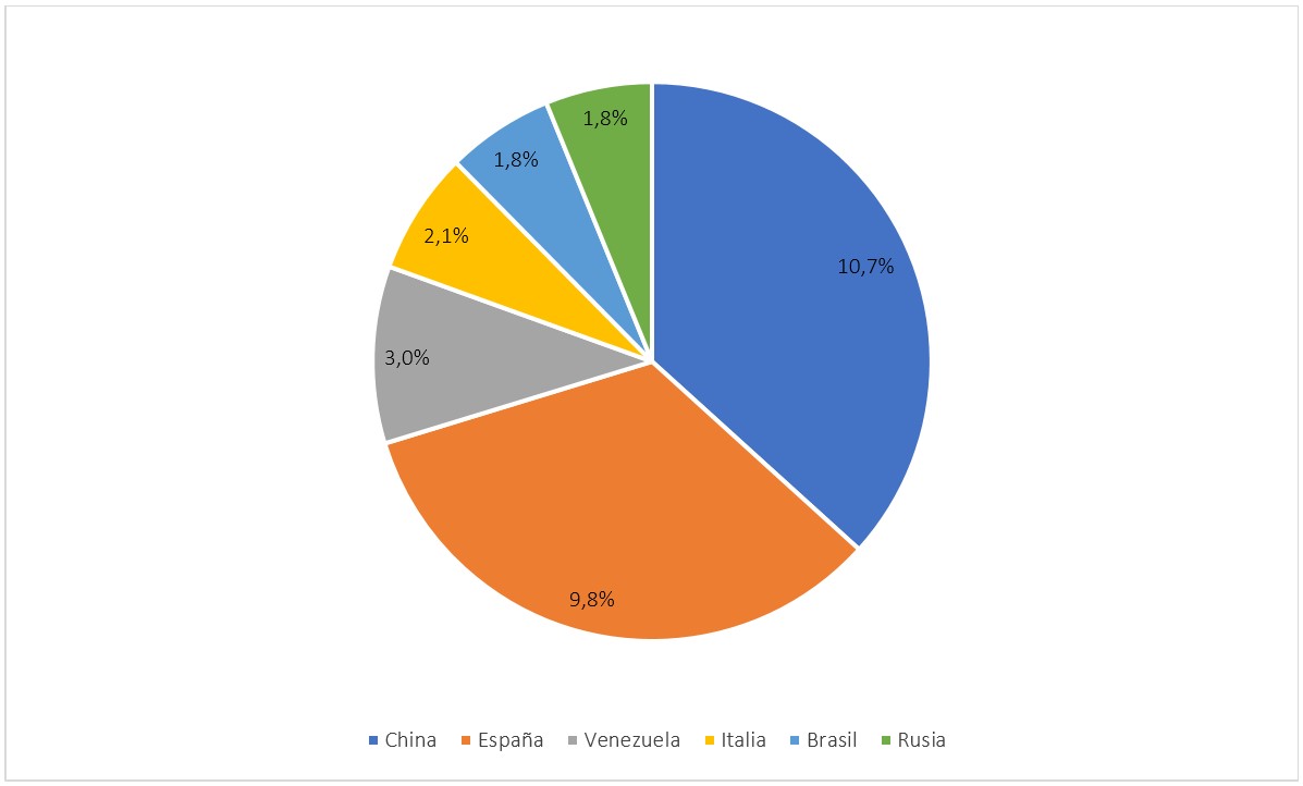 A su vez, los países de donde provinieron las importaciones con mayor valor fueron China y España, con un 10,7% y 9,8% del total del gasto realizado durante ese periodo, respectivamente, seguidos por Venezuela, Italia, Brasil y Rusia.