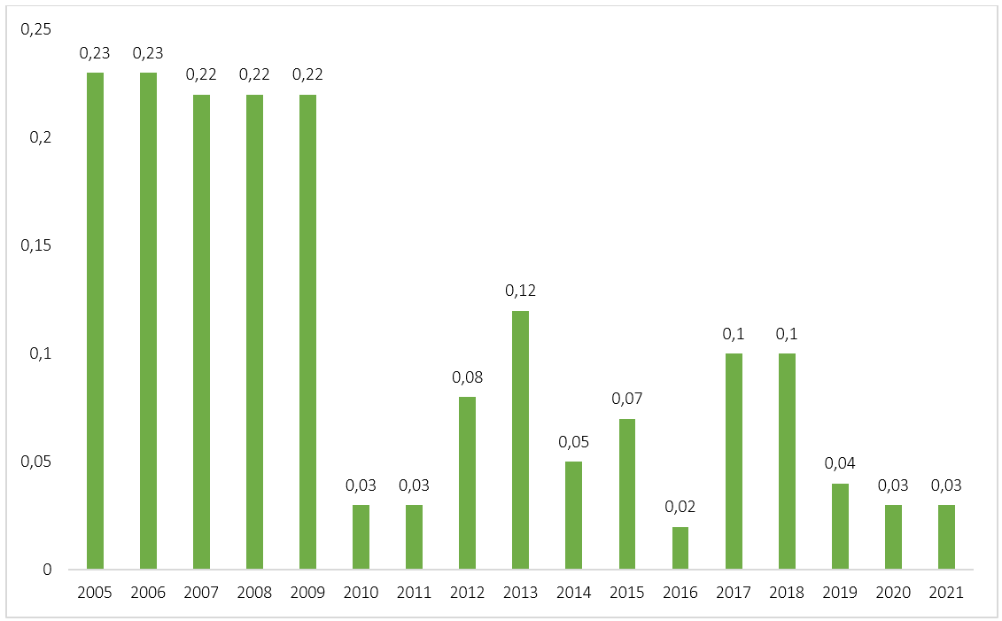 No obstante, en casi dos décadas, la superficie de tierra cultivable orgánica en el país no ha sobrepasado el 1%, muestra Our World in Data.