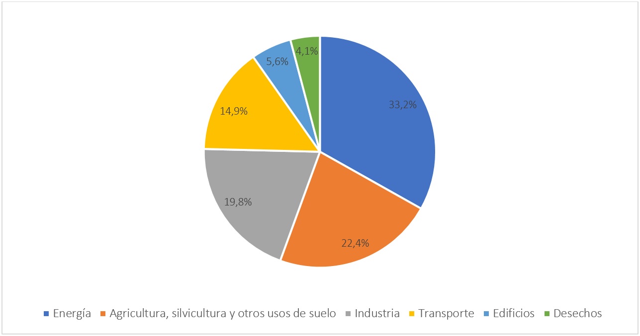 Desde 1990 los sectores que más contribuyen a las emisiones son el energético, el agrícola y el industrial. En 2019 constituyeron el 33.2 %, 22.4 % y 19.8 % de las emisiones globales respectivamente, mientras que el transporte, los edificios y los desechos representaron el 24.6 % restante.