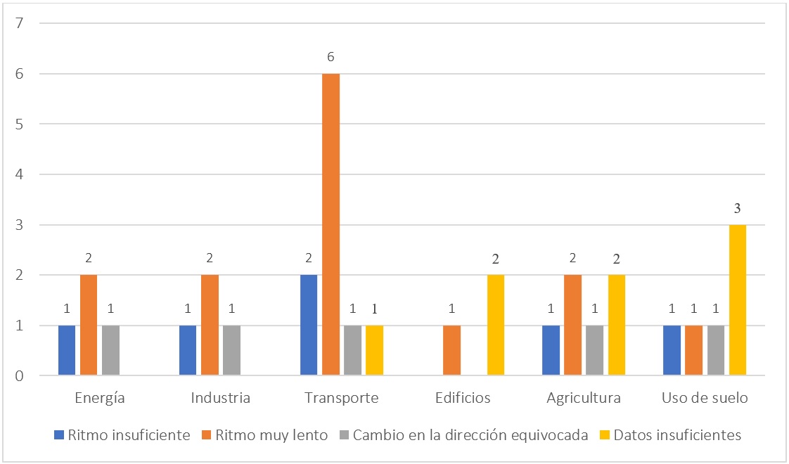 En cuanto a los indicadores de ritmo insuficiente se ubican la participación de fuentes de emisiones cero en la generación eléctrica, de vehículos eléctricos y con baterías en las ventas de vehículos ligeros y autobuses, la contribución de la electricidad a la demanda final energética del sector industrial, la reforestación, y la producción de carne de rumiantes.
