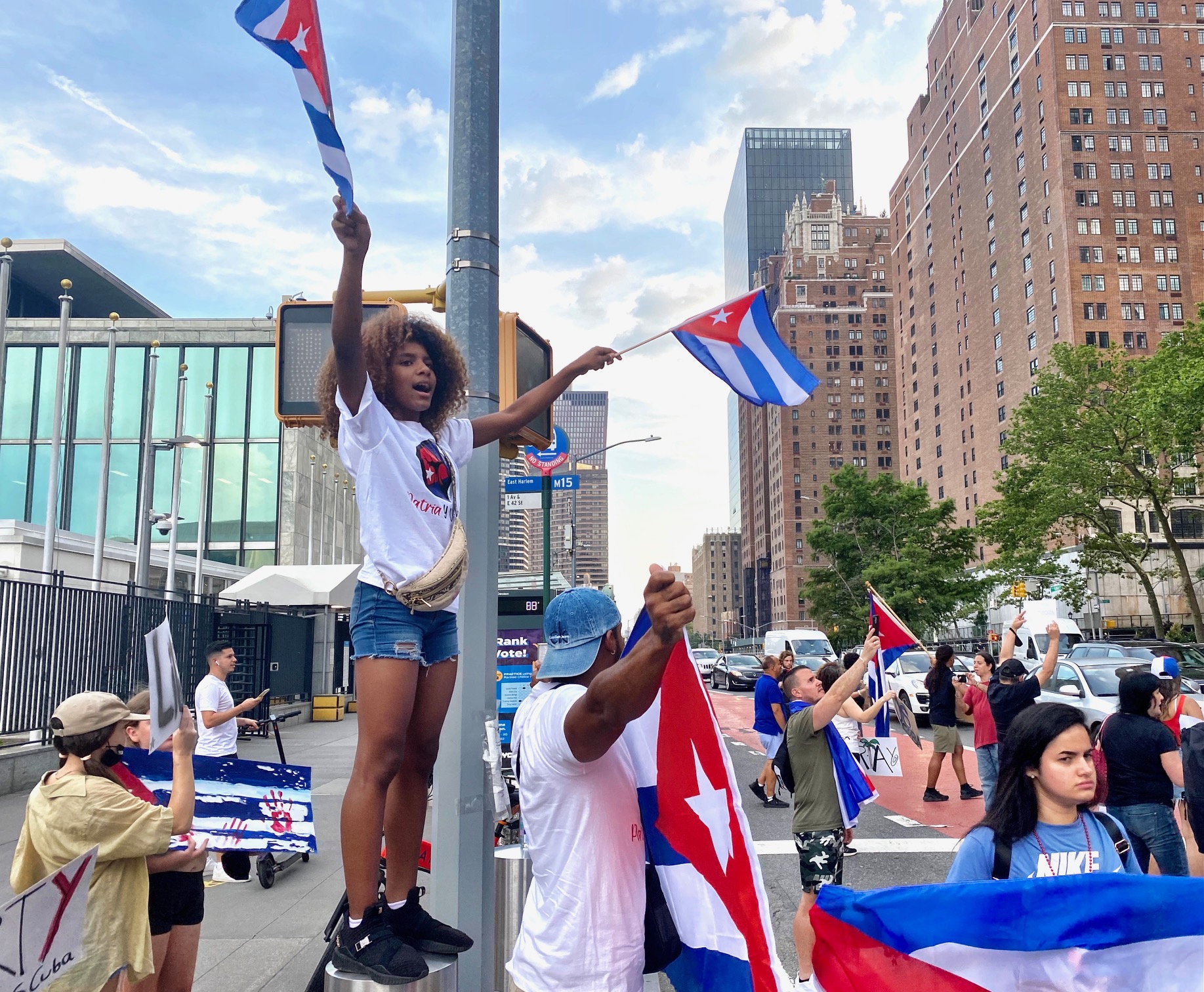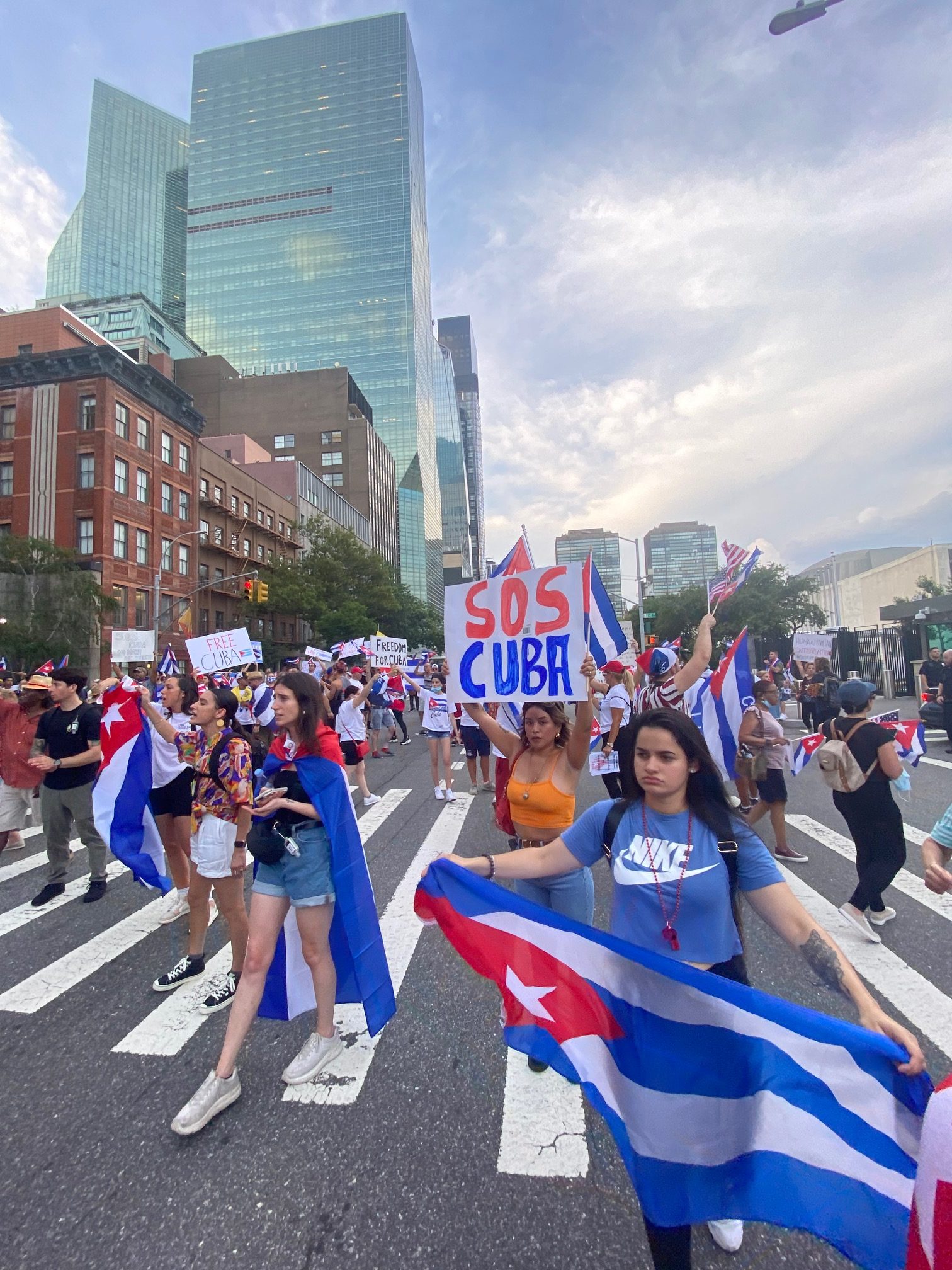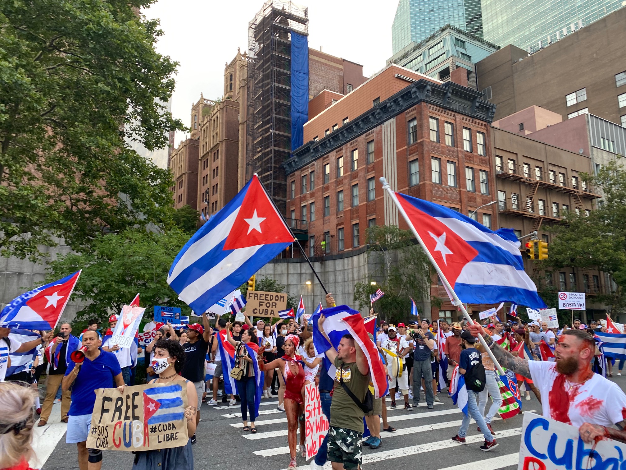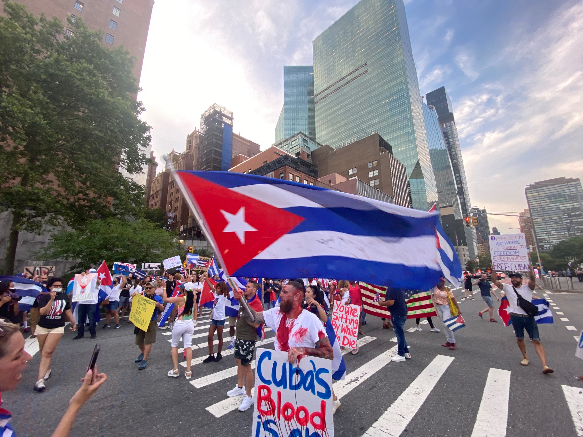 En solidaridad con el pueblo de la Isla, los manifestantes de Nueva York se dirigieron a Michelle Bachelet, la alta comisionada de Derechos Humanos ante la ONU. Entre cantos y banderas, exigían un llamado oficial de la ONU al Gobierno cubano para respetar los derechos humanos, la libertad de expresión y de reunión, así como la liberación inmediata de los manifestantes cubanos que han sido violentamente detenidos en la Isla y se encuentran incomunicados.