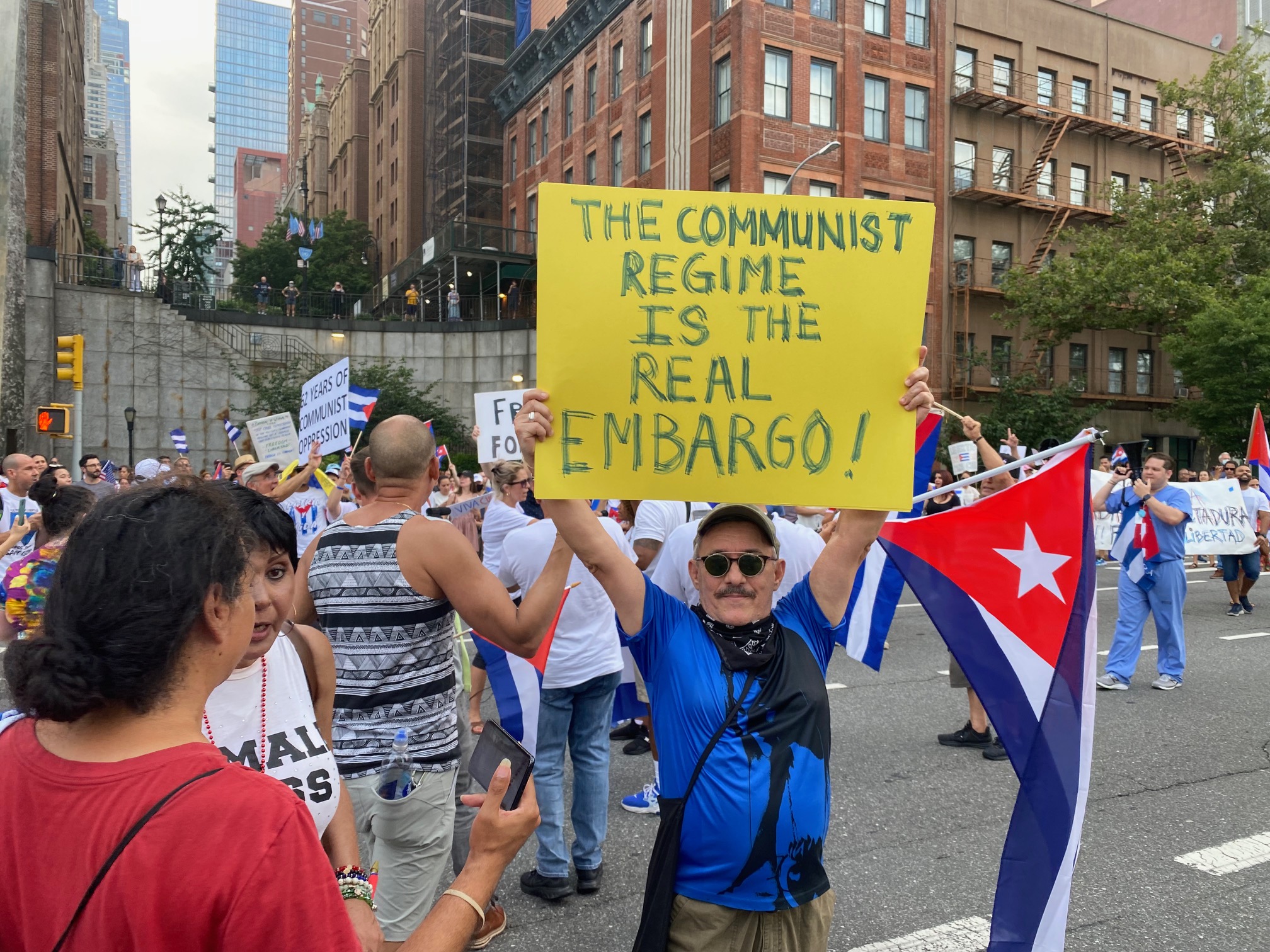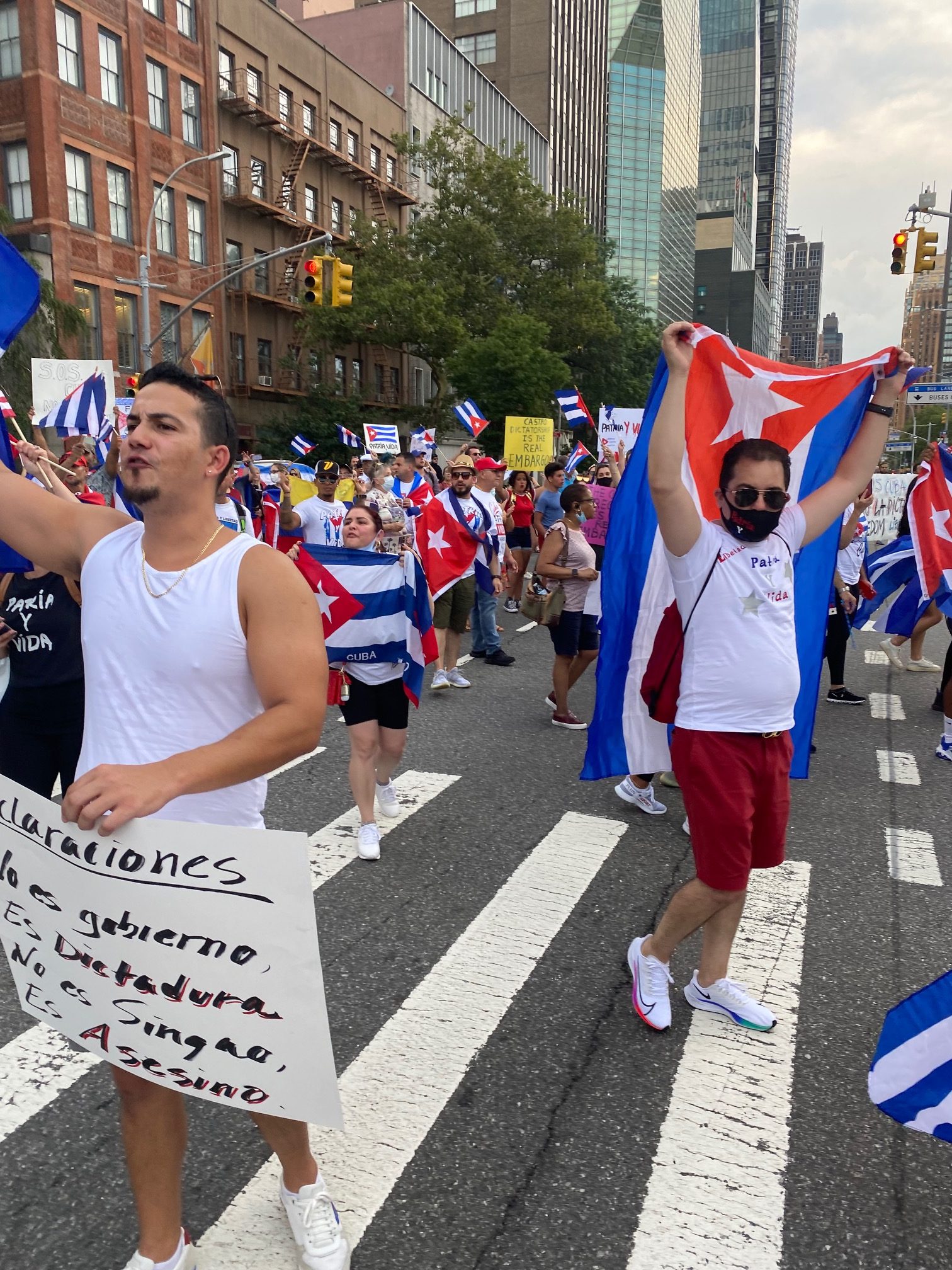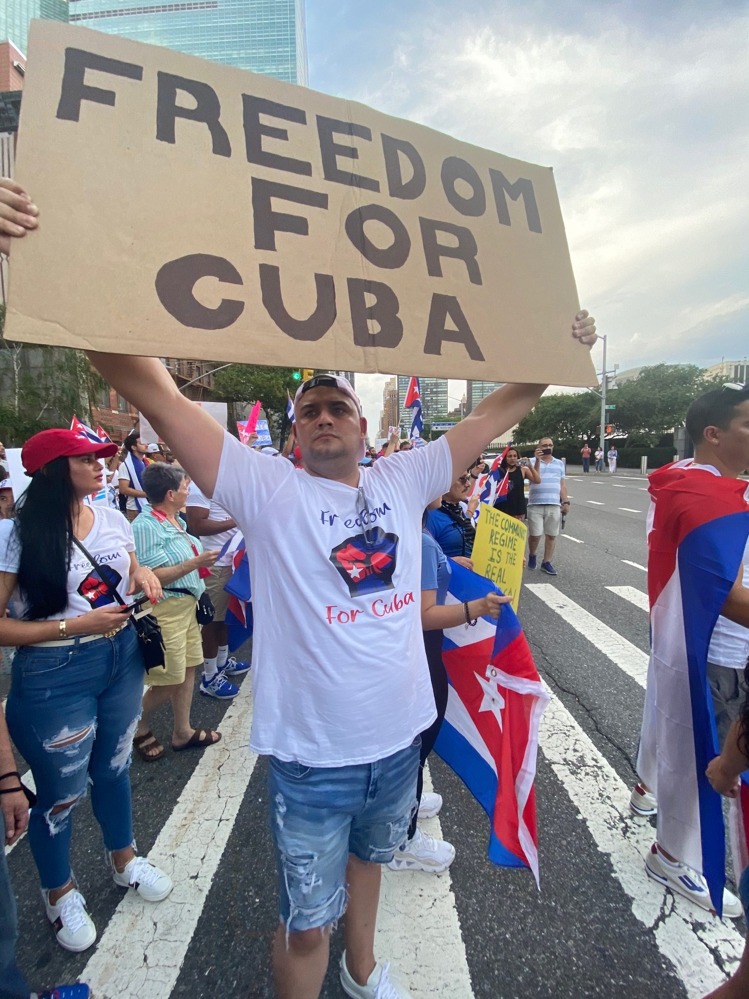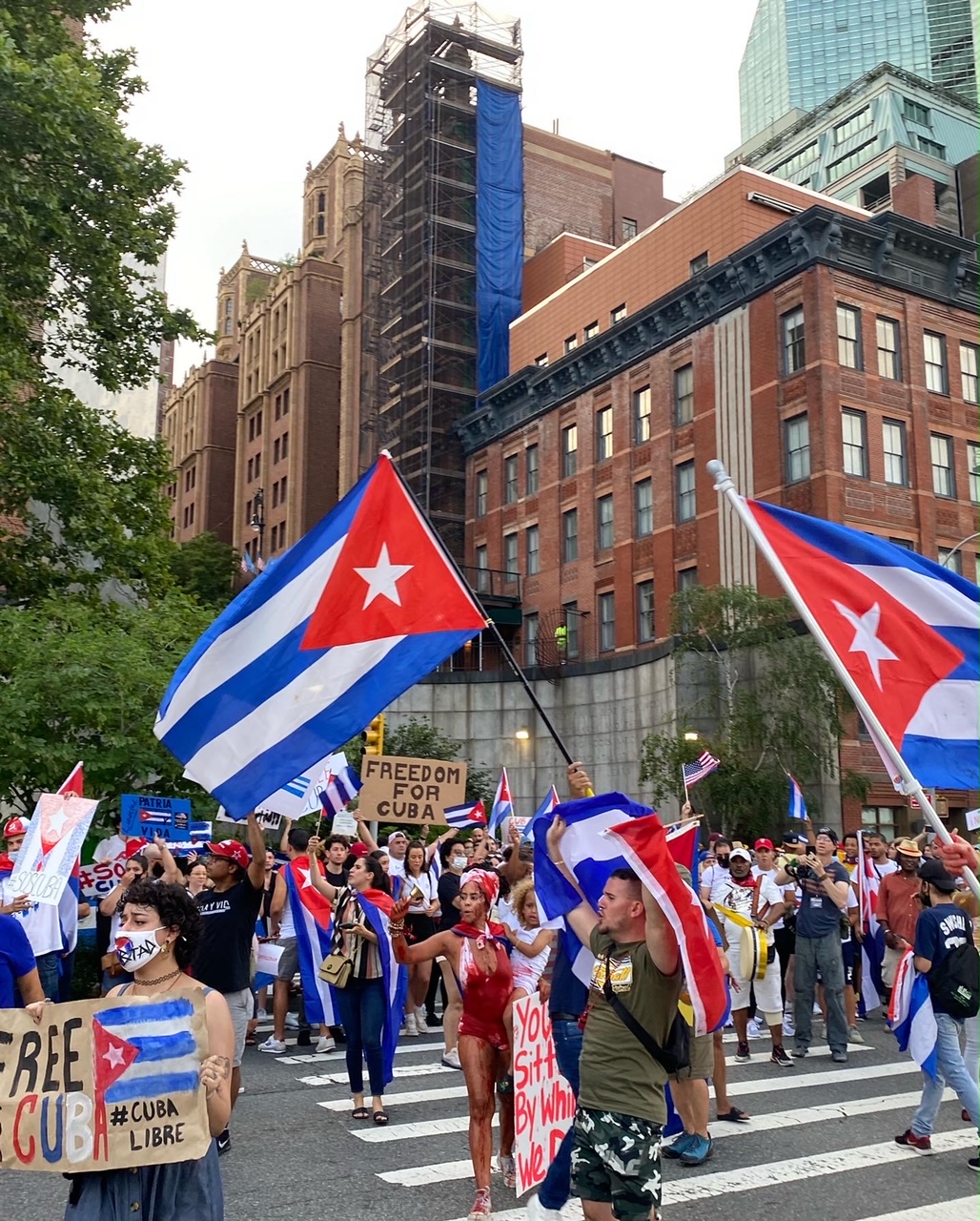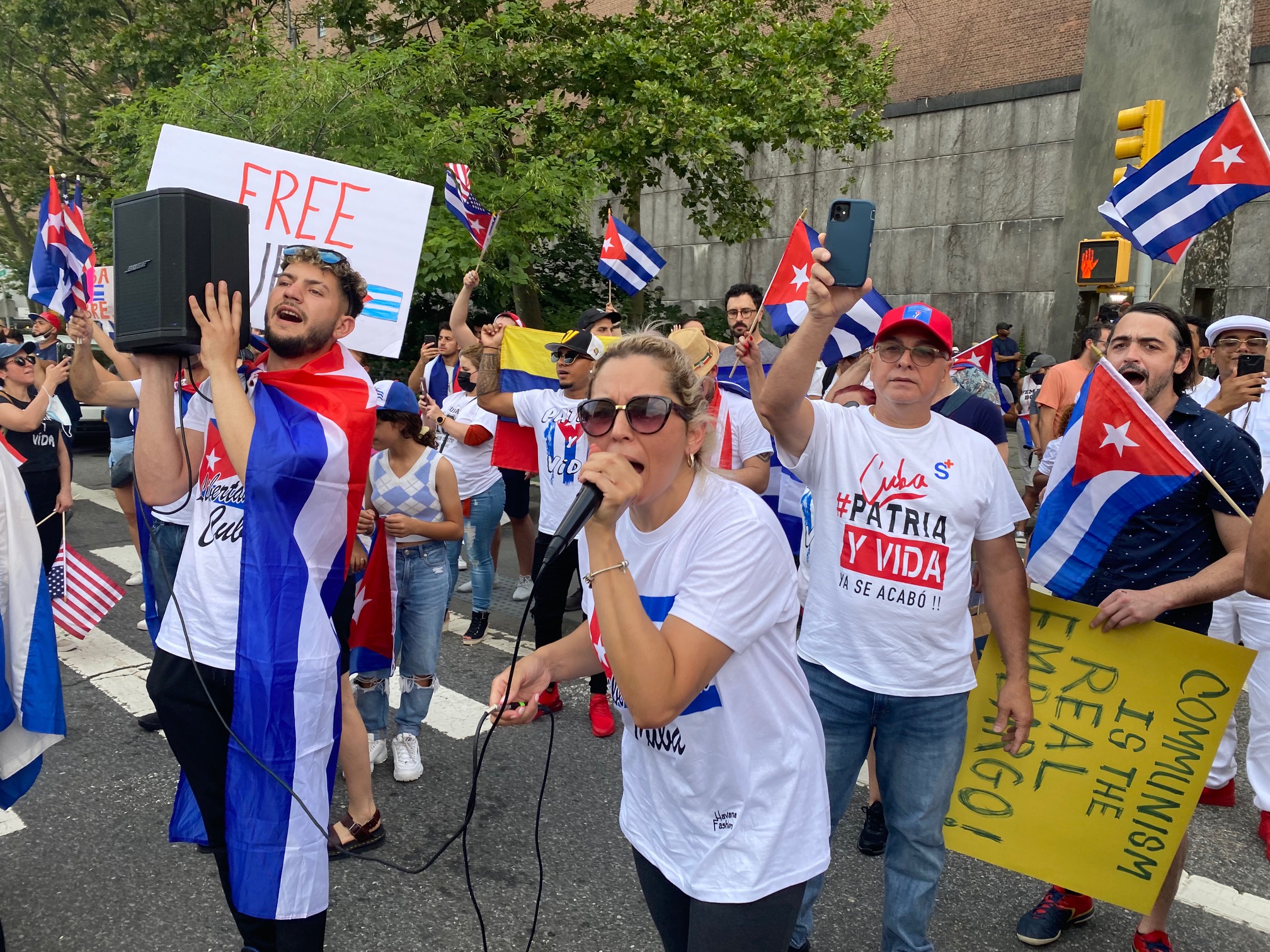 En solidaridad con el pueblo de la Isla, los manifestantes de Nueva York se dirigieron a Michelle Bachelet, la alta comisionada de Derechos Humanos ante la ONU. Entre cantos y banderas, exigían un llamado oficial de la ONU al Gobierno cubano para respetar los derechos humanos, la libertad de expresión y de reunión, así como la liberación inmediata de los manifestantes cubanos que han sido violentamente detenidos en la Isla y se encuentran incomunicados.