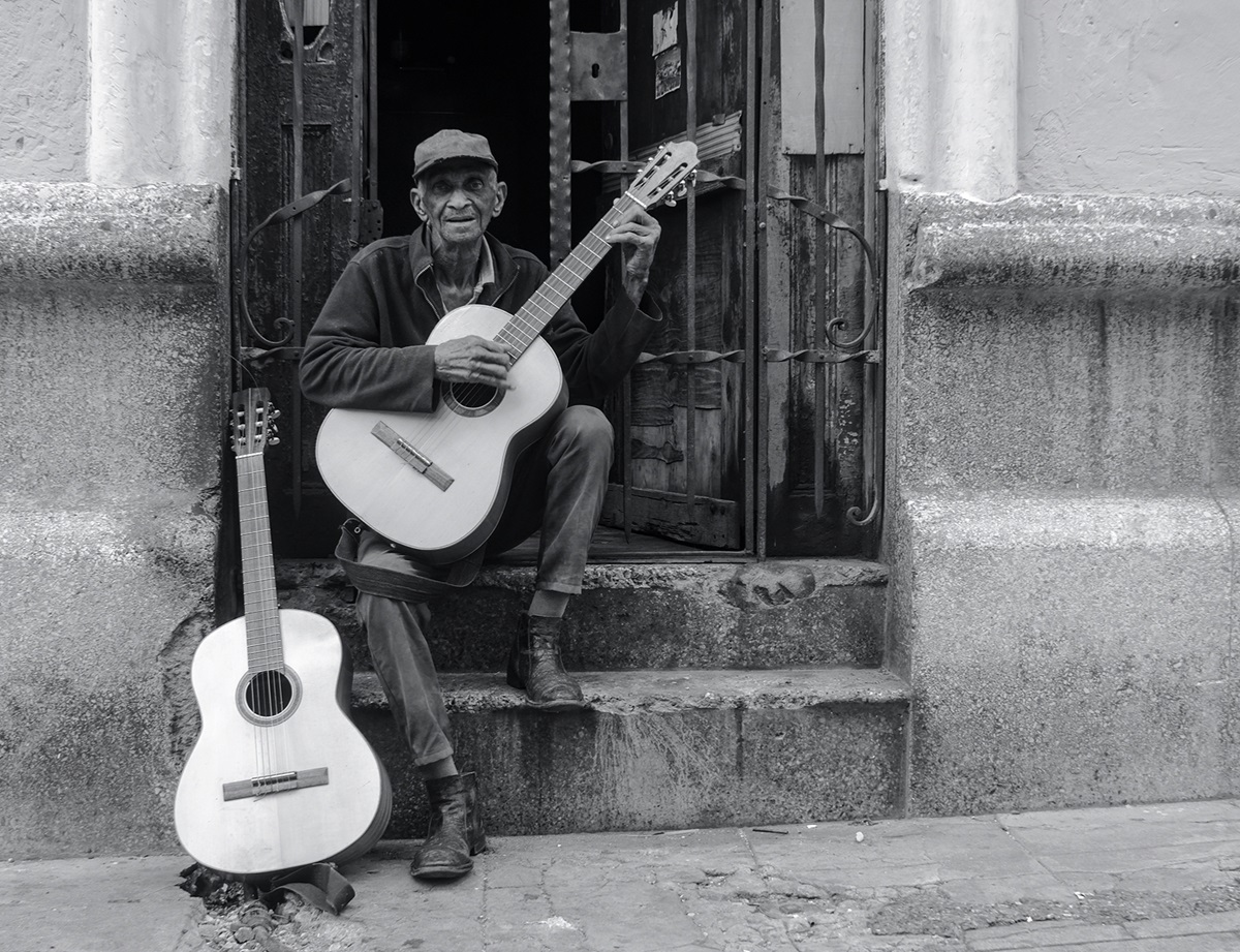 Jorge (84 años) es de esas personas que tienen el don de la empatía y de la música. Pasa largos ratos sentado con su guitarra en la puerta de su casa en Centro Habana; la acaricia, la limpia y la admira como si fuera un gran trofeo. Llama la atención ese vínculo tan especial que tiene con este instrumento.