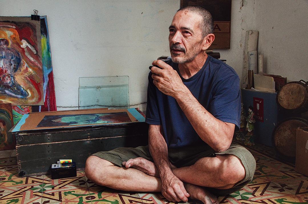 Cuando entro en la casa-taller de Omar Pérez (La Habana, 1964) en Centro Habana, lo primero que llama mi atención es su pintura colgada de ladrillos rojos e imperfectos. Es la casa de un poeta, me digo. La casa del autor con el título más atrevido de la editorial Letras Cubanas: Crítica de la razón puta.