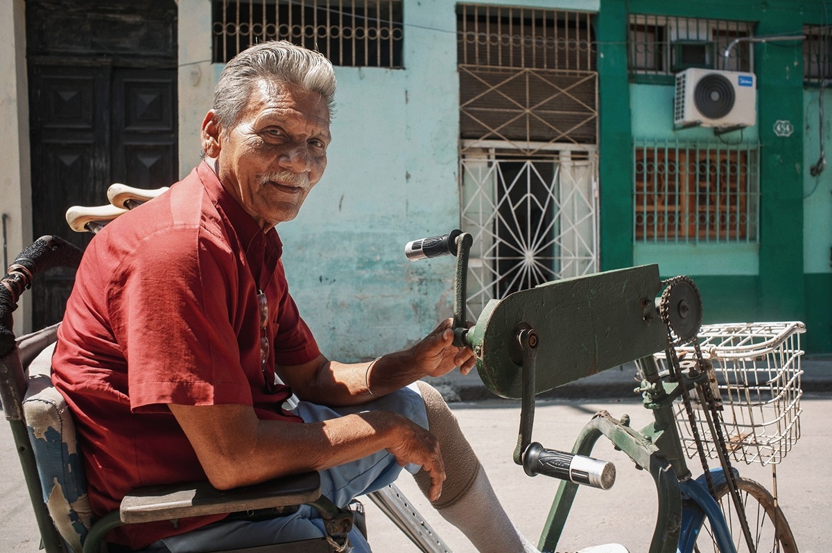 Hace un par de décadas decidió construirse una bicicleta para transportarse mejor, pero esta tenía que responder a sus propias necesidades, así que colocó un pedal que funcionara manualmente y adaptó cada pieza a su comodidad. Con su ingenio logró ser mucho más independiente, ya puede salir a la calle, hacer los mandados e ir a donde sus manos lo conduzcan. Más que una bici se fabricó una posibilidad, un movimiento.