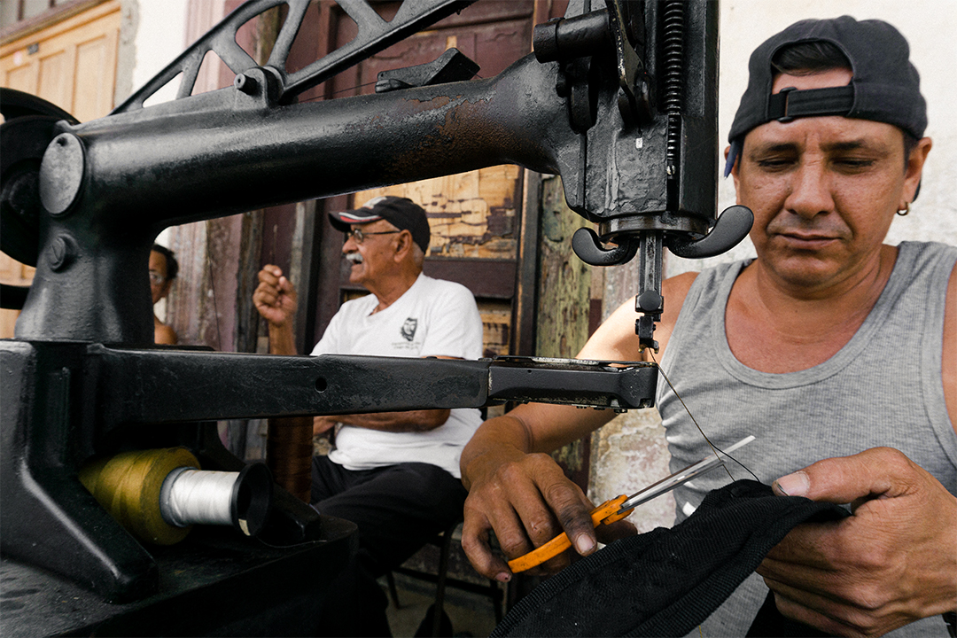 Siempre que tiene tiempo libre, Rafael saca la máquina de coser a su portal de la calle Independencia, en Ciego de Ávila, y comienza a dar pedal mientras debate con sus amigos de pelota (Foto y texto: Christian Carralero).