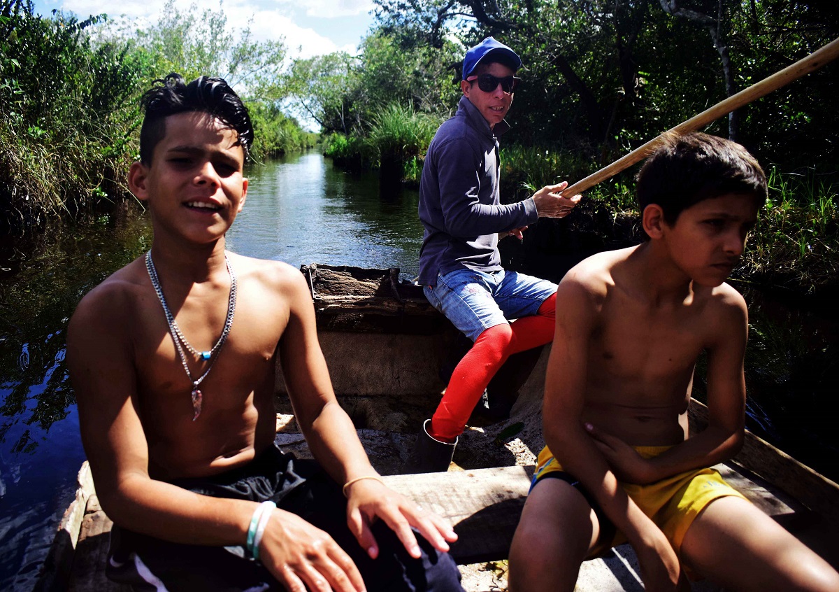 Gringo hizo un campamento al lado del canal, cerca de donde empieza, y le llamó El Gurugú. Es un claro de monte donde acomodó palos para sentarse. Ahí invita a almorzar a alguna mujer o se despeja solo. Cuando desembarcamos, Gringo limpia con el machete. Mantenimiento, dice. Le tiene mucho cariño a este sitio. Desde el bote, Javier lanza una pita de nailon. Usa claria de carnada. Claria para las clarias. Ya lleva media hora y cada vez saca el anzuelo vacío. Dice que no hay peces, que sigamos hasta La Ferminia. Los niños suben mojados y Gringo palanquea por el centro de la zanja, sin orillarse, unos 300 metros. Cerca de la hierba hay palangres: cordeles que sujetan decenas de carnadas. En los palangres debe haber pescados pero dice Javier que no son suyos. La Ferminia es un puente de madera a donde llevan turistas a ver el pájaro del mismo nombre, pequeño, gris, endémico de la Ciénaga. Los guías conducen a los turistas por ese puente hasta un descampado, llaman a la ferminia con el móvil –les ponen la grabación de su canto–, los turistas miran posarse al pájaro, hacen fotos. Ya. Son diez minutos. El bote en que vamos, y otros tres amarrados a la orilla del canal, están ahí para ser utilizados en estas excursiones. Cuando no hay turistas los pescadores piden permiso a una estación del CITMA que hay cerca de la zanja para usarlos. Gringo hace de guía a veces y se gana 10 CUC.