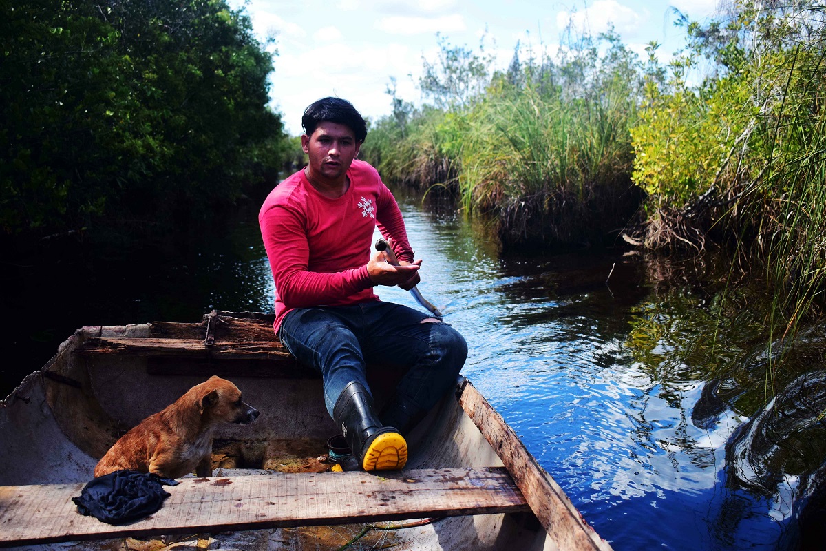 Vamos en un pequeño bote rojo llamado Maneadero 5214 por un canal estrecho, de unos 20 kilómetros de largo, que desemboca en el río Santo Tomás. El canal no es profundo. Cuando más, el agua da a la cintura. La palanca se hunde en el fango y hace avanzar el bote. Vamos con Javier, Gringo, dos niños sin camisa y el perro jutiero, aunque no vamos a coger jutías sino pez gato, un pez grande y grotesco al que también llaman claria. “Aquí puede salir un cocodrilo. Ha pasado mil veces”, dice Gringo. “Pero tranquilo que estás en un bote y no te va a pasar nada”. Ayer, cuando Eduardo me trajo a ver el canal –la zanja, como le llaman– me contó que se desborda en tiempos de mucha lluvia y se bota par de cuadras tierra adentro. Por eso construyeron un puente de madera que conecta el canal con la zona que se inunda. Cuando eso sucede los cocodrilos, de alguna forma, llegan hasta allí, se les ve en reposo, a unos 500 metros del caserío. Gringo ha visto muchos cuando sale a pescar. “Pero tranquilo –ríe–, yo te defiendo si aparece alguno”. Los niños, sin embargo, se tiran a nadar.
