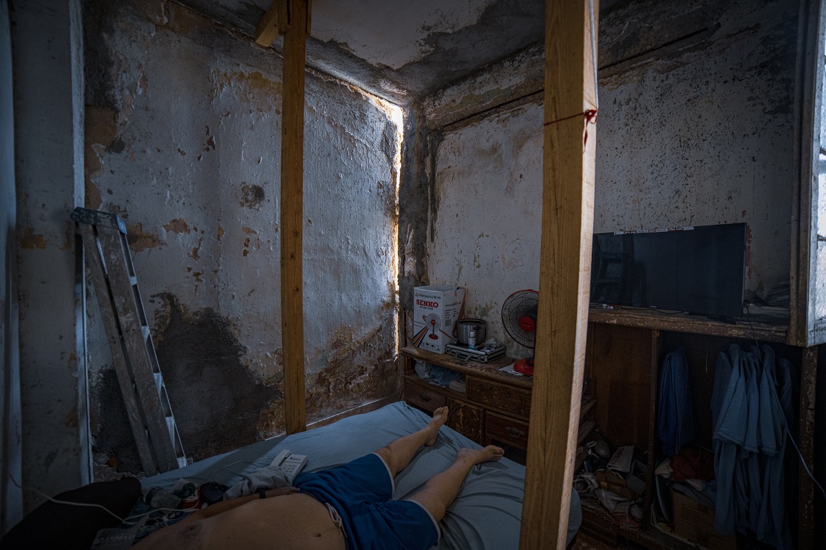 Apuntalaron los apartamentos. Una de las cuatro vigas de la sala quedó frente a la cama de Nayivi, que estaba en Párraga donde su abuela. Las paredes en un hilo. Cuando llueve entra agua por las esquinas. El techo en la viga. Desplomes que ocurren de vez en cuando.