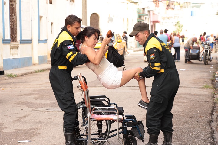 Nayivi marca del móvil. “Ordene”, le responden. Está empapada en sudor y cansada. Huele a mentol por la crema que le untan para los ejercicios. Compra un pan con jamón, pide un cigarro, habla con cualquiera. Aprovecha el tiempo y también mata el tiempo, porque a veces los bomberos se demoran. Si están en el comando de Zapata y 6, Vedado, donde radican, vienen rápido –siete minutos en auto por la ruta que calcula Google Maps–. Y si está en crisis corren lo más que puedan. Pero si están en un derrumbe o algo, toca esperar. Ha pasado aguaceros en la acera. Los vecinos le han prestado sombrillas. Y ha almorzado allá abajo lo que sea que le traigan los vecinos. El último día de carnavales de 2019, por ejemplo, amaneció ahí, en esa “zona caliente” donde acaban las carrozas y la música y salen borrachos y llueven cuchillos. Los bomberos llegaron al día siguiente. Estaban “en un servicio que no podían abandonar”.