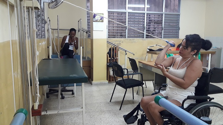 El próximo ejercicio consiste en levantar pequeñas pesas halando un cordel que pasa una roldana; como hacer mancuernas para los bíceps, pero a través de un mecanismo instalado en la pared. Otros días camina con ayuda de barras paralelas, hace banco de cuádriceps para los muslos o maniobras en el colchón para el equilibrio. Y otros días le dan magnetoterapia desde las rodillas hasta la columna, corriente estimulante en la pantorrilla, calor en los tobillos. Ahora, mientras levanta las pesas, la fisioterapeuta, una mulata atlética con ropa deportiva, revisa el celular. Luego se acerca y le dice que mejora. Nayivi asiente porque casi siempre también siente que mejora. Una vez logró salir en muletas de la sala de rehabilitación.