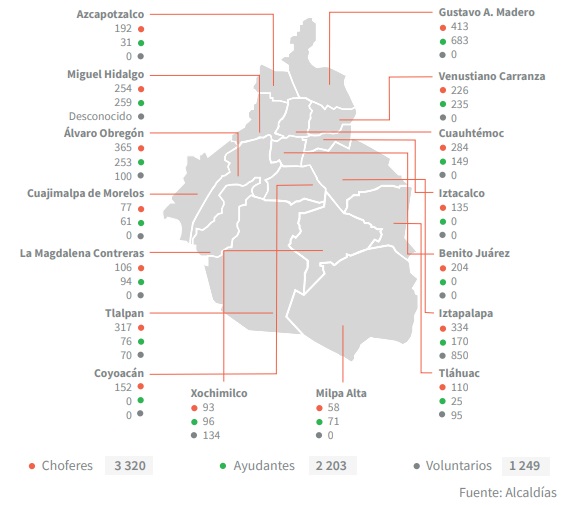En la mayoría de los 2 594 camiones que hay en la Ciudad, el conductor si es empleado del gobierno: tiene contrato, prestaciones, acceso a un sindicato y un salario que oscila entre cinco mil y 14 mil pesos (245 y 685 USD), según la Plataforma de Transparencia; aunque en algunas alcaldías llega a ser menor a tres mil (147 USD) y en otras hasta 18 mil pesos (881 USD), por los bonos.