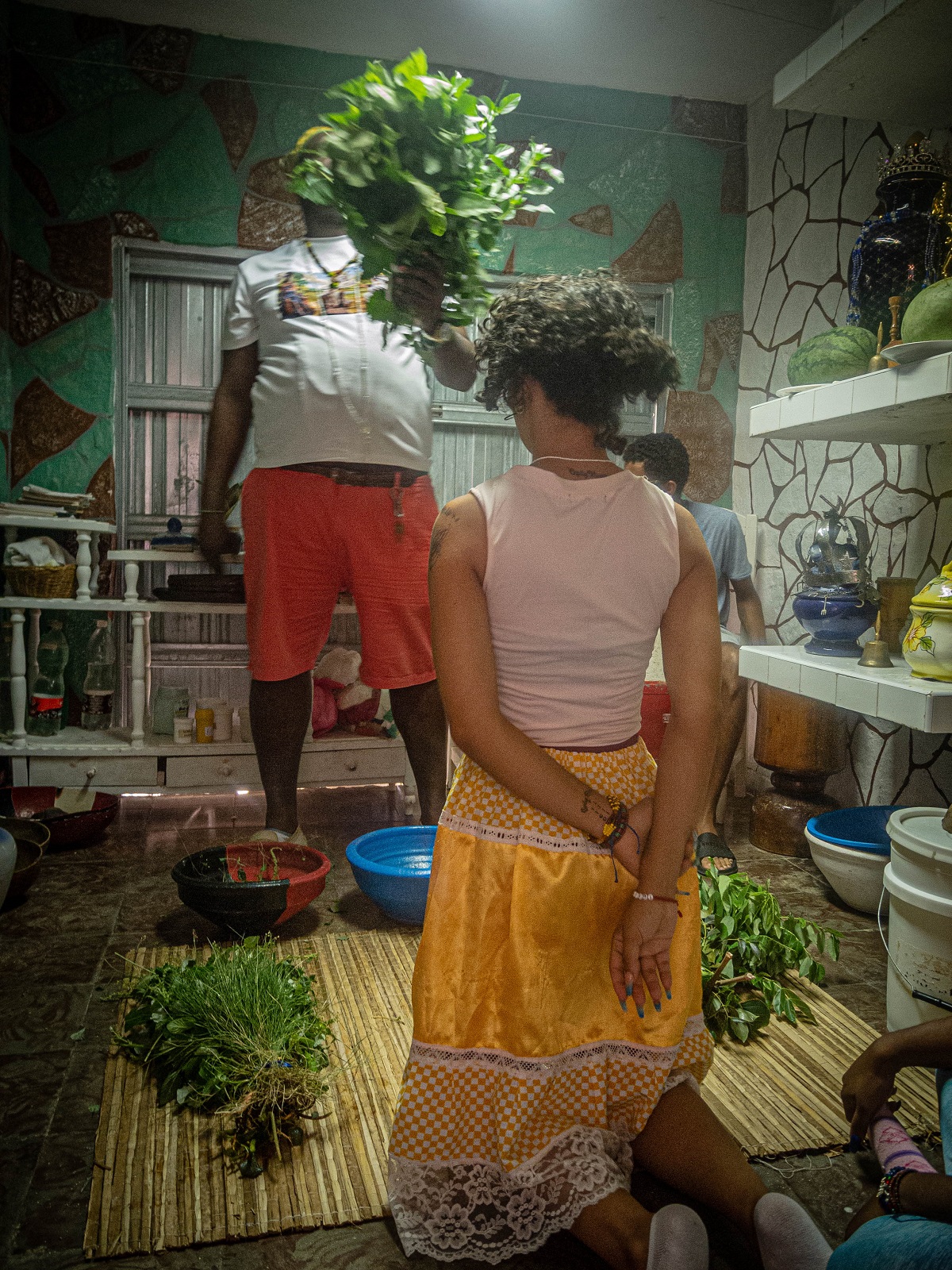 Son las seis de la tarde y el tambor a los muertos está a punto de acabarse. El Cabildo Fermina Gómez ati Eşu Dina es una feria llena de gente con prisa. Caminan de un lado a otro, hablan a la vez, llevan fuentes vacías a la cocina y transpiran en abundancia debajo de la ropa blanca. Una mujer amable nos ofrece asiento: “ya viene Dulce María”. La casa es grande, con ventanas y puertas que se abren y cierran sin cesar. Está cuidadosamente pintada y sobre las paredes se observan dibujos de signos religiosos y frases inspiradoras. El atardecer se fuga hacia un altar con fotos y vasos de agua. Sobre el borde de la copa principal la descomposición de la luz despliega un diminuto arcoíris. Se extingue al instante en que mis ojos se mueven a otro ángulo para estudiar la belleza de un Olokun frondoso, elegante.