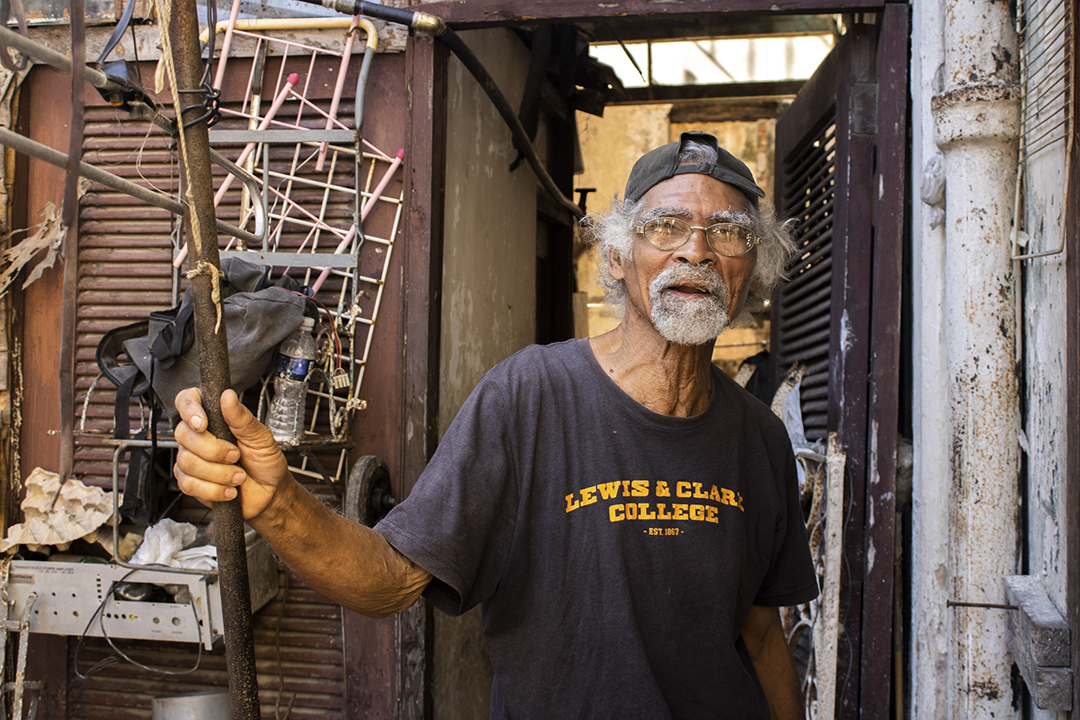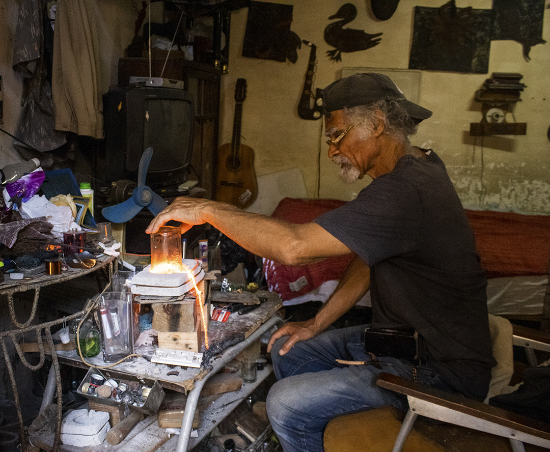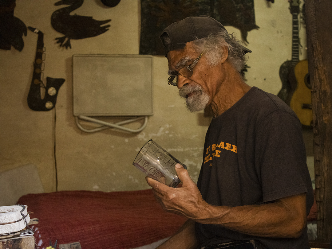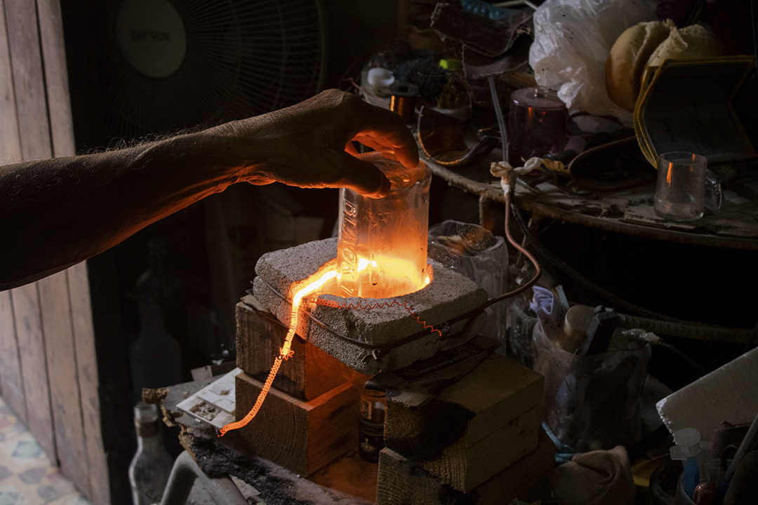 Osvaldo Padrino Esquivel (72 años) vive solo en una ciudadela cerca del antiguo hotel Isla de Cuba, Habana Vieja. Fue compositor, guitarrista y vocalista del grupo de música Contratiempos hasta su desintegración. Desde los años 90, Osvaldo practica de manera artesanal la confección de vasos con botellas recicladas. Utiliza moldes de piedra pómez, además de una resistencia eléctrica con enrollado de alambre de nicrom; el calor de la resistencia fractura el vidrio a la altura del molde, dando como resultado cortes precisos, casi sin imperfecciones.