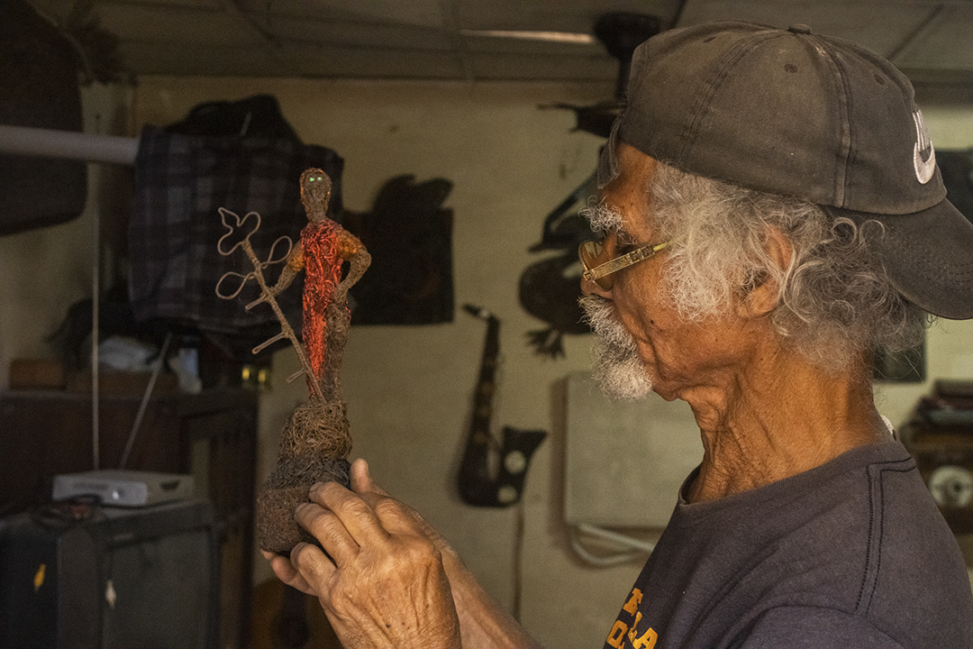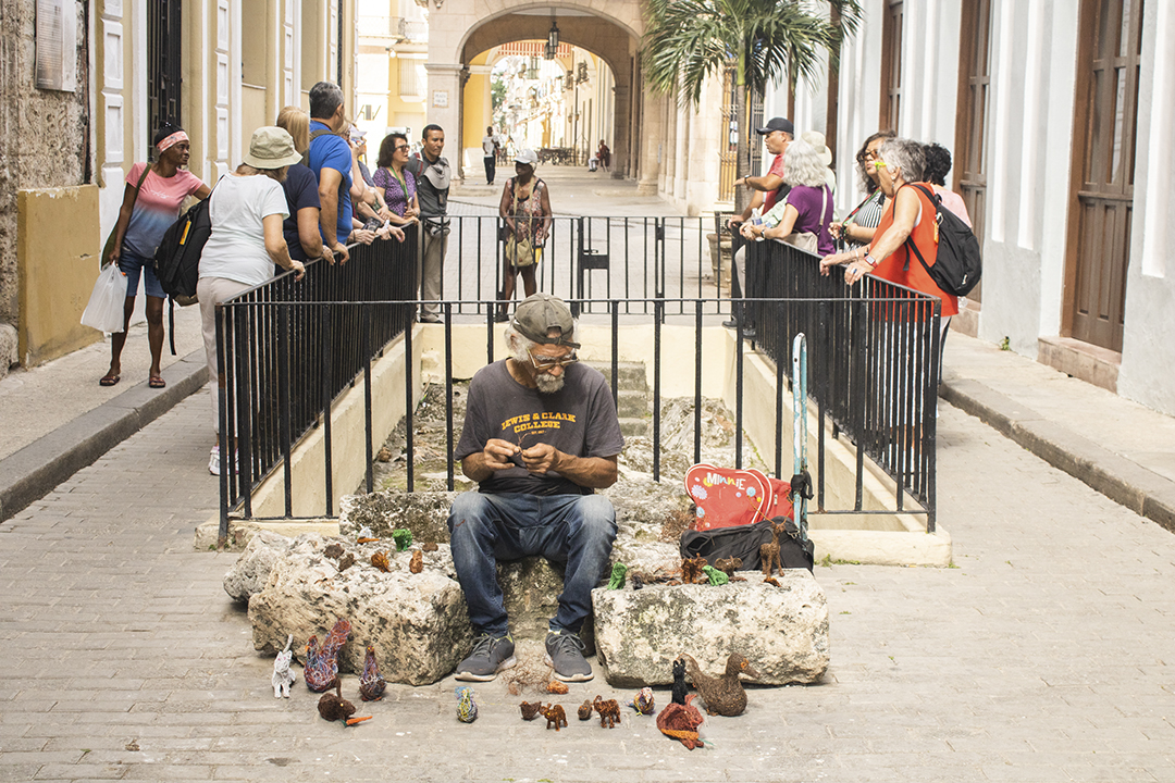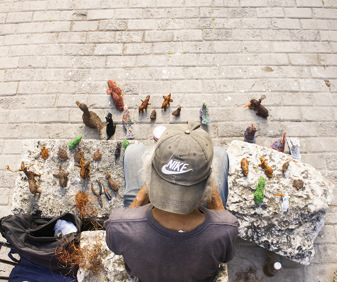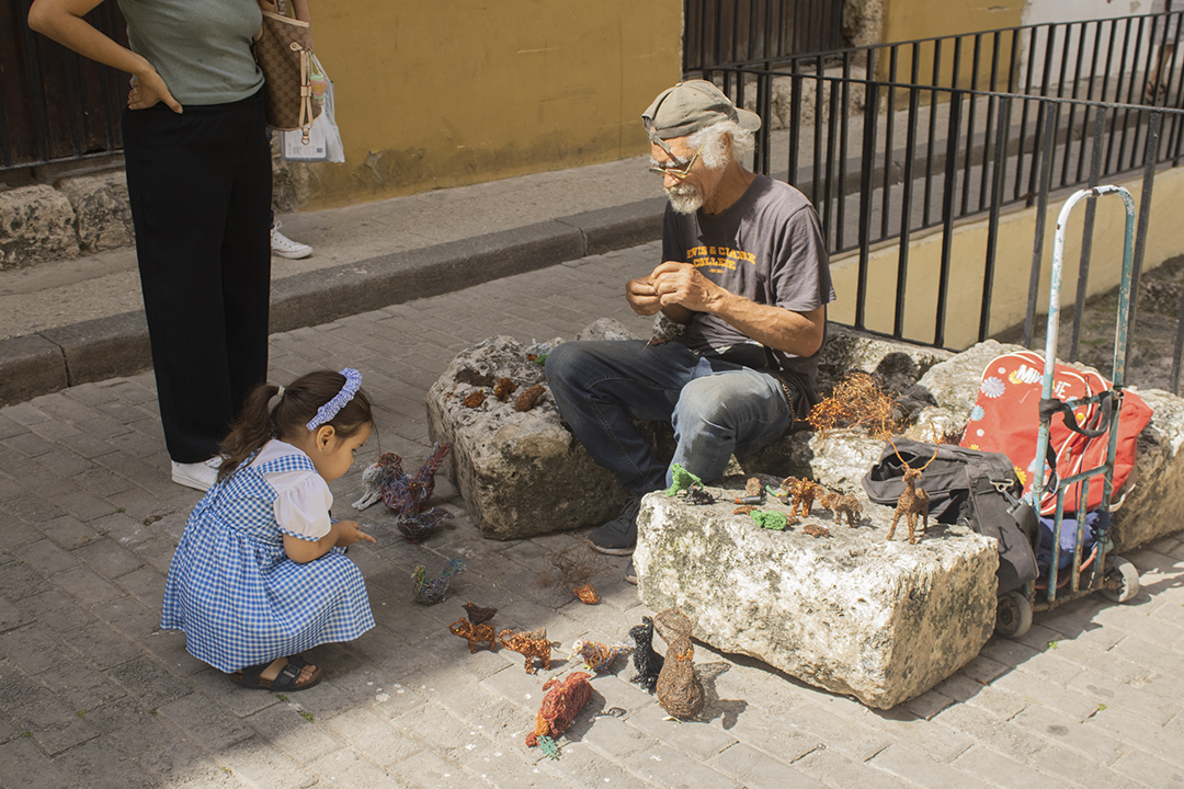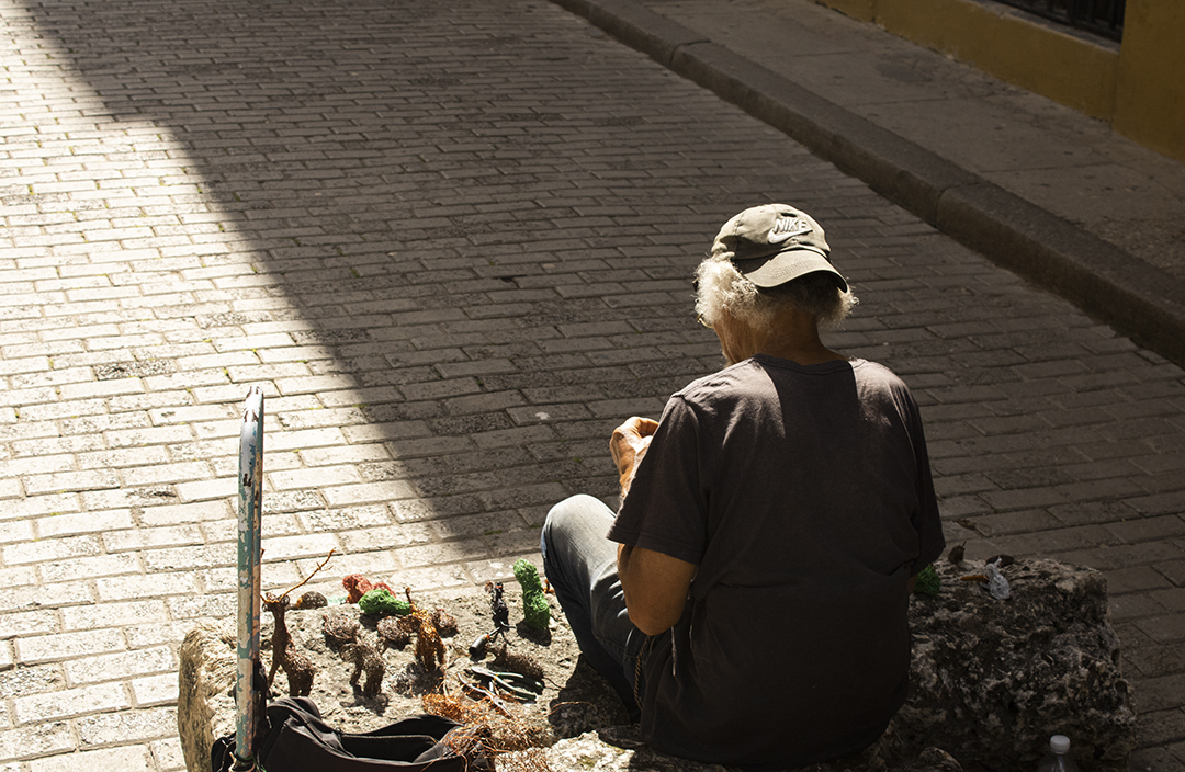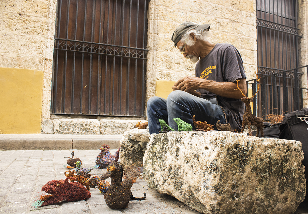 Osvaldo también dedica su tiempo a la confección y venta de piezas de artesanía realizadas con alambre; aprendió la técnica durante un curso en la Casa de la Cultura de Centro Habana, en el año 2005. Se sienta todos los fines de semana en las piedras de la calle Teniente Rey, entre Oficios y Mercaderes, donde el flujo de turistas no falta en ciertos horarios y, con suerte, logra vender unas cuantas esculturas de alambre, siendo los elefantes los favoritos de las personas. Entre tantos bazares donde se repiten los mismos productos de puro cubaneo, Osvaldo logra llamar la atención de los transeúntes con un arte original que se distingue en el comercio de artesanías de la ciudad.