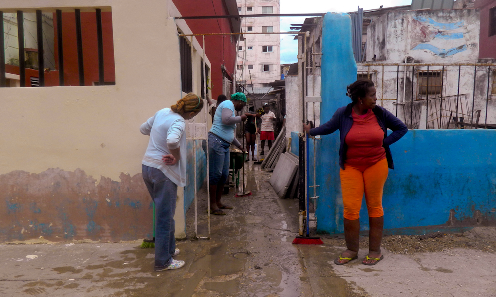 Esa ciudadela es la más vieja de la zona y fue un sitio para guardar caballos antes de la Revolución. Una caballeriza. Esto lo cuenta Teresita, la delegada del Poder Popular (la única rubia de la foto), que no vive ahí, pero que fue a ayudar a limpiar el churre que arrastró el agua.