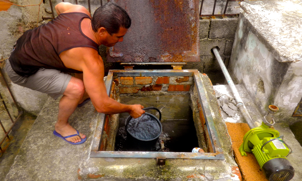 Trabajan en equipo en el solar. En equipo sacan a cubos el agua contaminada de la cisterna, para después llenarla de nuevo con agua potable. Lo hacen ellos mismos, porque no quieren esperar por los camiones de la Empresa de Saneamiento Básico, que están priorizando el Centro de Negocios de 1ra y B.