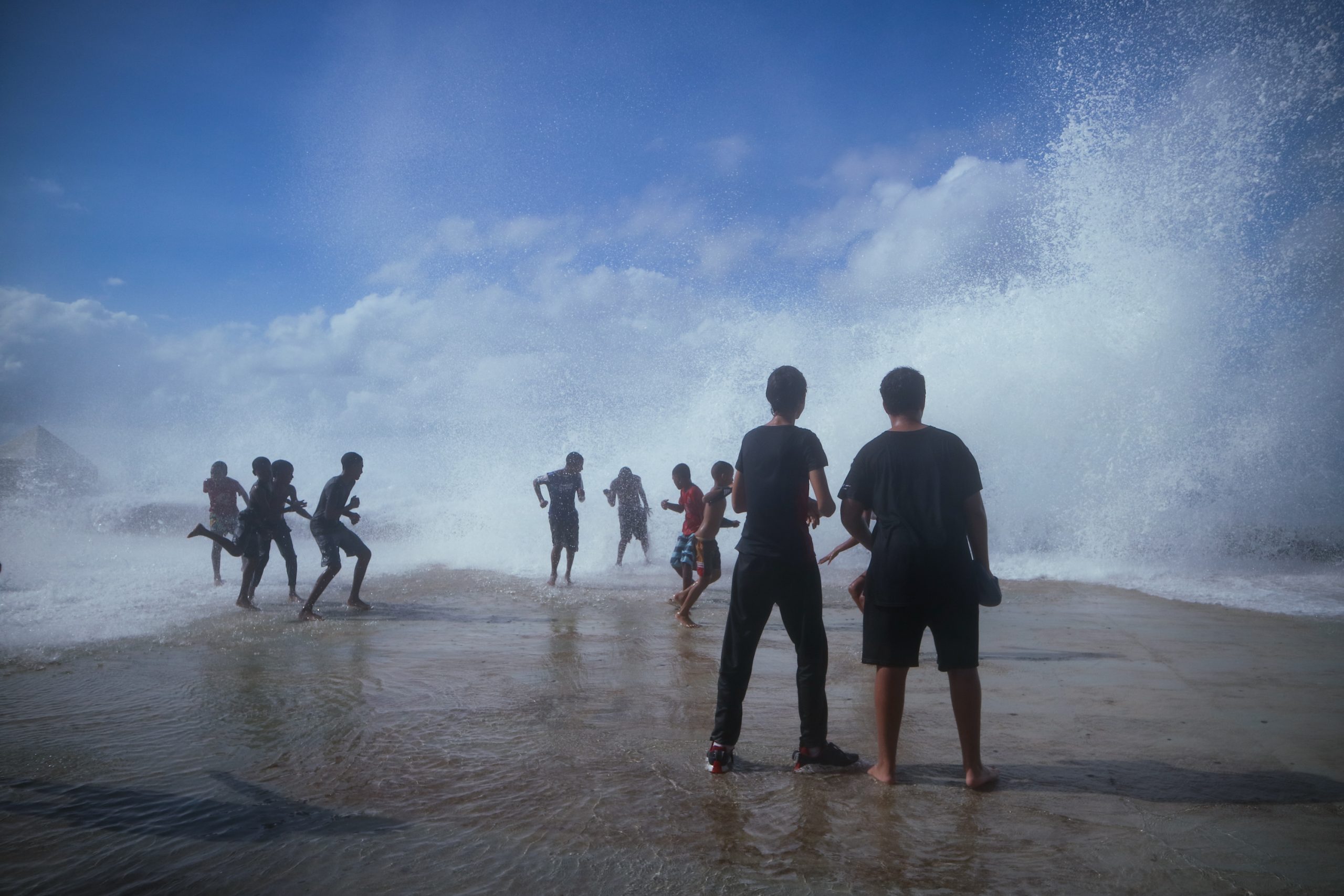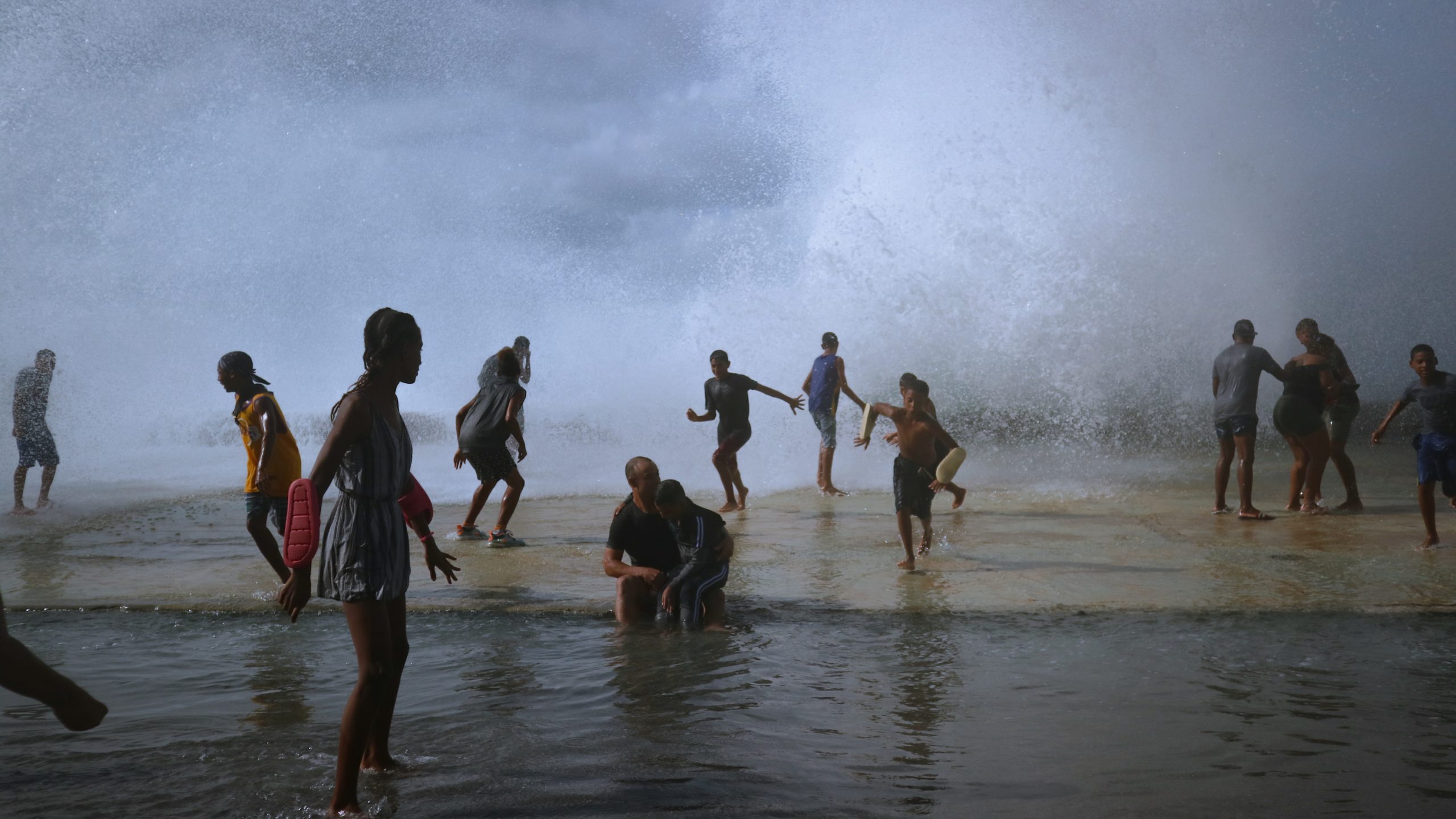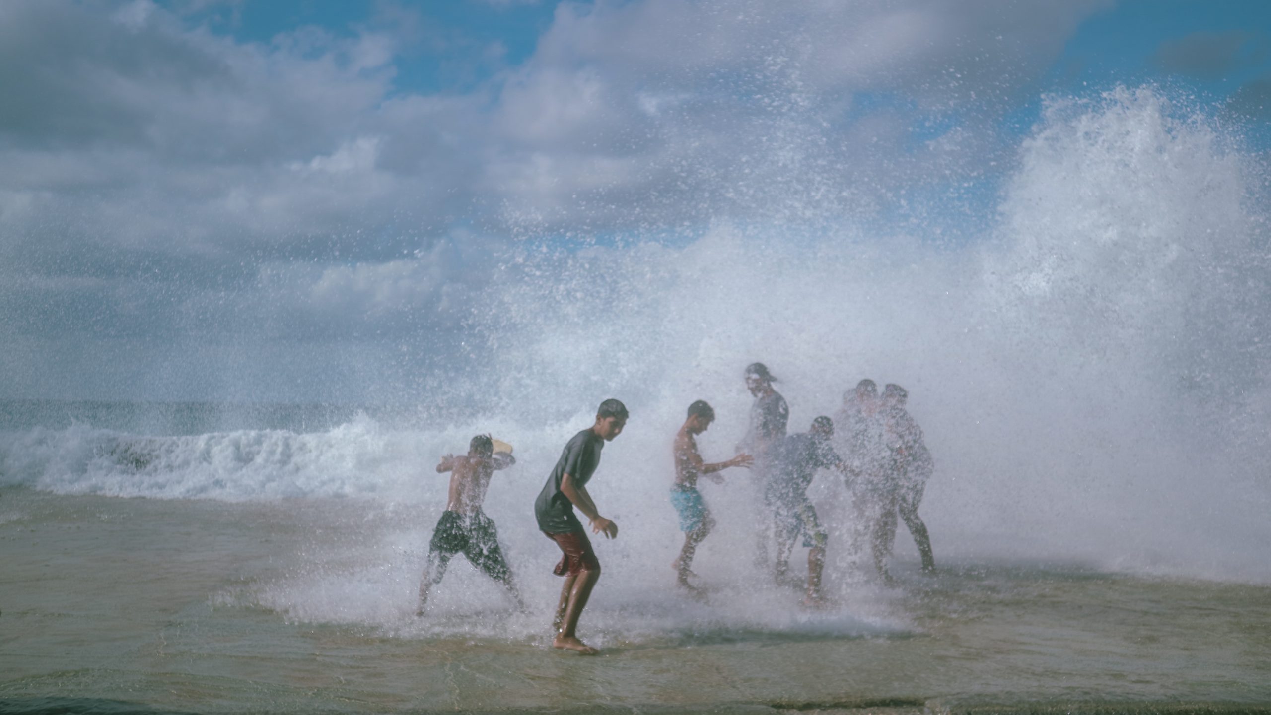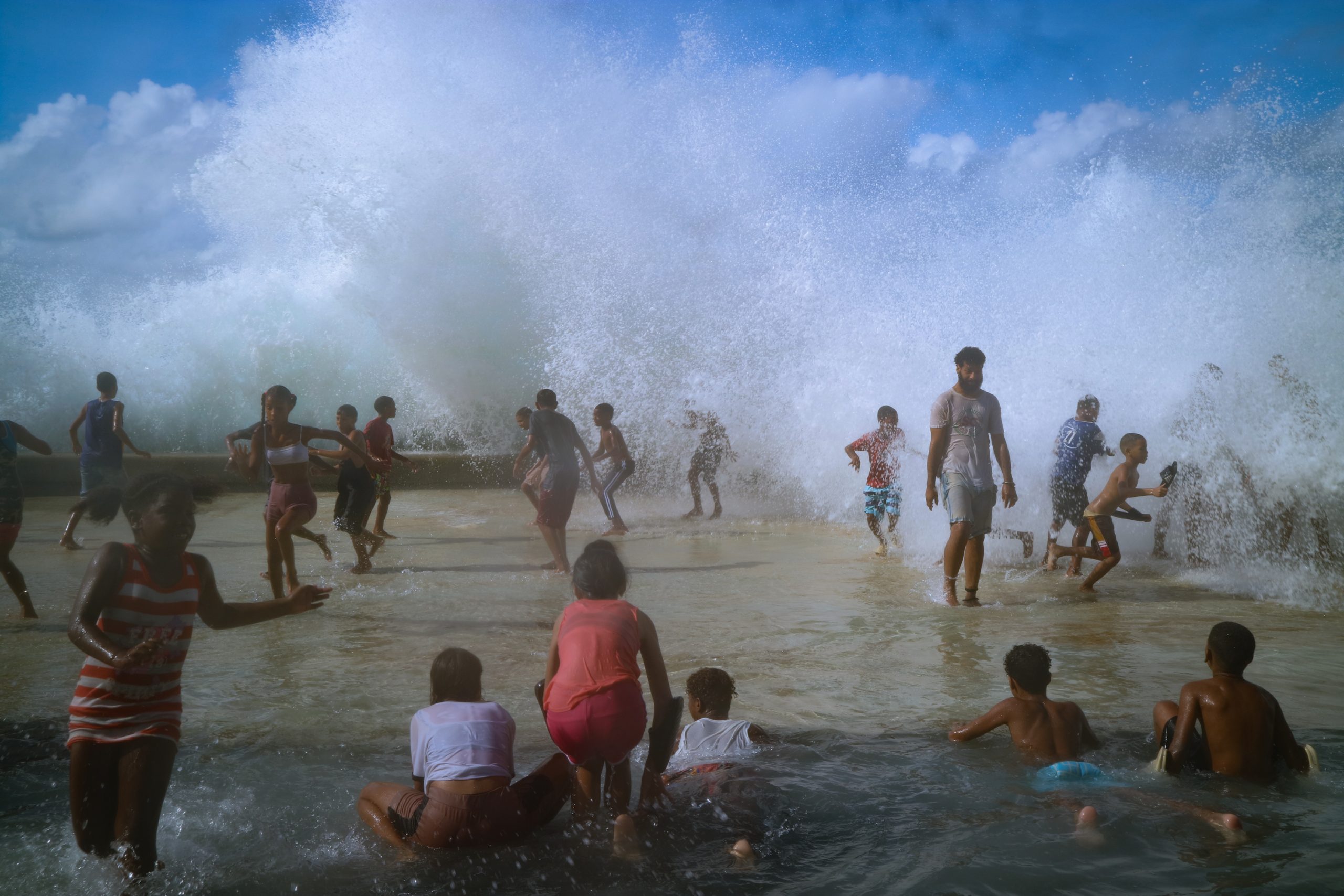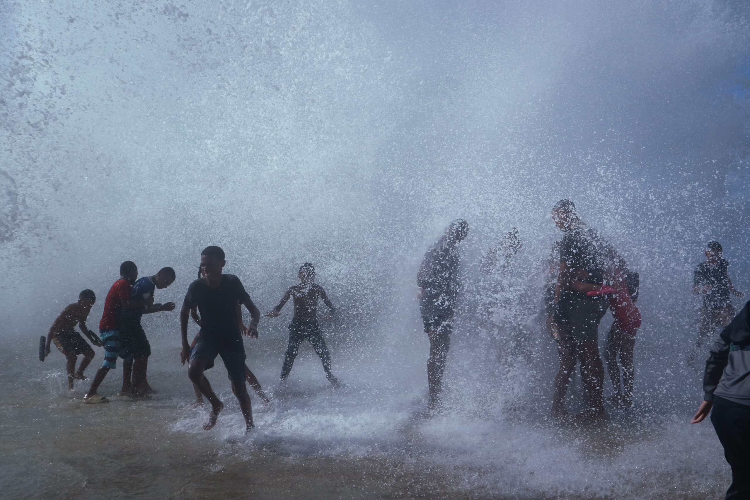 Miraban atentamente para saber por qué lugar rompería la ola y hacia allí corrían todos, una y otra vez. En los momentos de calma se acostaban en la calle inundada a la espera de que regresaran las olas. En ocasiones, el mar arremetía con una potencia mayor de la esperada y entonces corrían en dirección contraria o se abrazaban entre todos para reducir el impacto. Todo esto sucedía entre risas y tensión liberada, reflejos de un ambiente de catarsis colectiva.