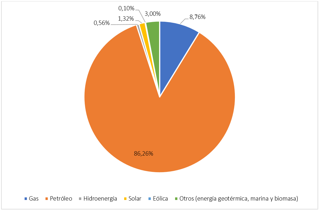La Isla posee una marcada dependencia de los combustibles fósiles para la generación de electricidad. En 2021, estos contribuyeron en 95% a su producción, donde el petróleo representó la fuente con mayor empleo.