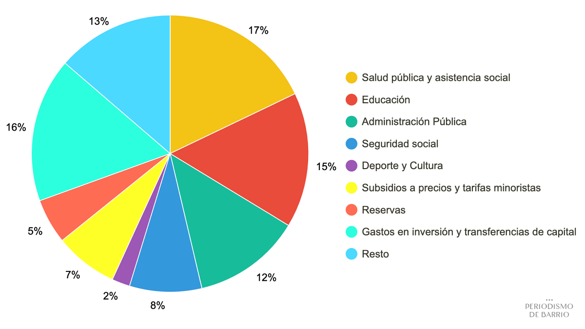 La distribución de gastos muestra las prioridades que establece el gobierno cubano. Este año la mayor cantidad de recursos estarán destinados a la salud y la asistencia social, con 67 mil 41 millones 600 mil pesos cubanos, aproximadamente, un 18 % del gasto total. En segundo lugar, se encuentran los gastos en inversiones y transferencias de capital, con 62 mil 462 millones 700 mil pesos cubanos, que representan el 16 %; y luego la educación, con 57 mil 777 millones 700 mil pesos cubanos, el 15 % del total.