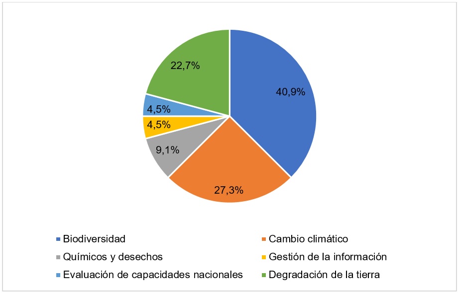 De estos últimos, la mayoría se ha enfocado en la biodiversidad, seguido por cambio climático y degradación de la tierra. El resto se ha centrado en el manejo de químicos y desechos, la evaluación de capacidades nacionales y la gestión de la información y el conocimiento para la planeación y la toma de decisiones.