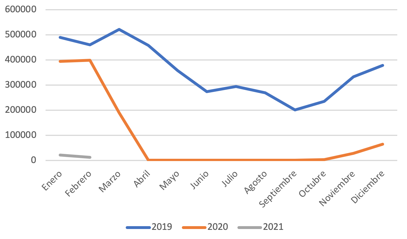 A fines de diciembre de 2020, Cuba había experimentado una reducción de 74.6 % en la llegada de visitantes internacionales con respecto a 2019. Para febrero de 2021, el descenso había sido de 95.5 % en comparación con los meses de enero y febrero del año anterior.