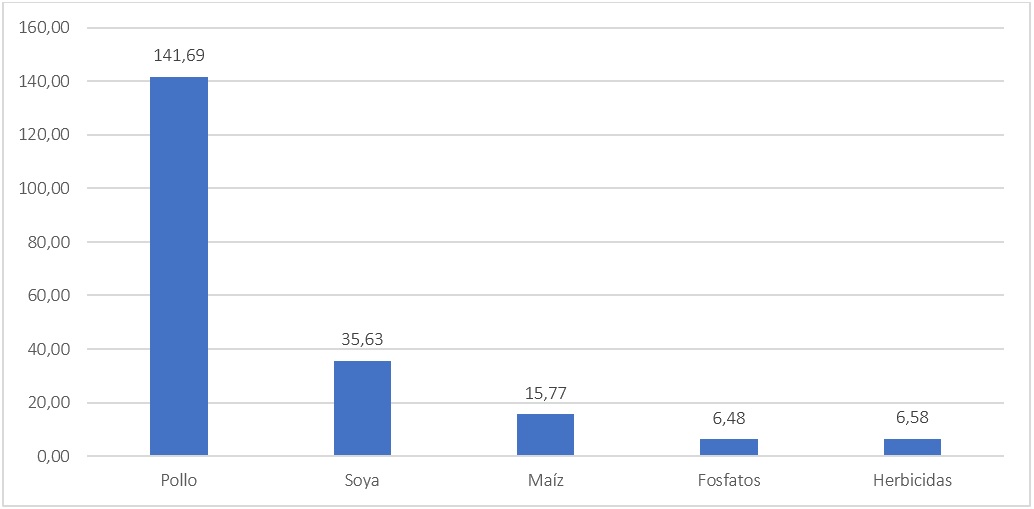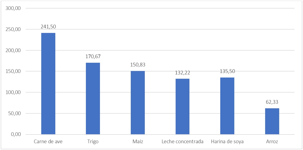 De ellos, el más costoso ha sido el pollo, con 1 133 millones de USD en total y un promedio anual de 141 millones.