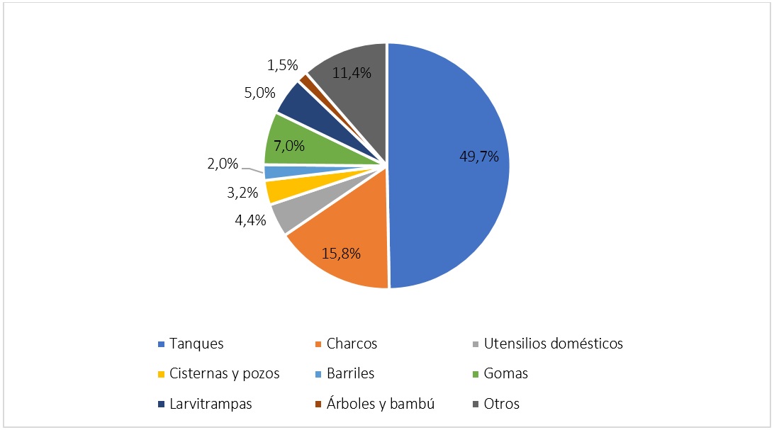 De los 342 biotipos larvarios del Aedes vittatus recolectados en Santiago de Cuba, casi la mitad se descubrieron en tanques bajos, elevados y artificiales, seguidos por los charcos y otros depósitos.